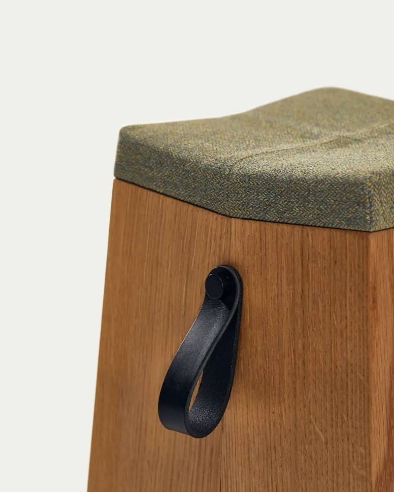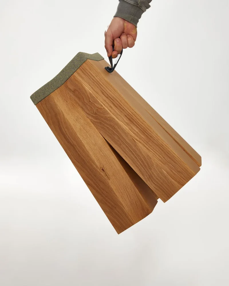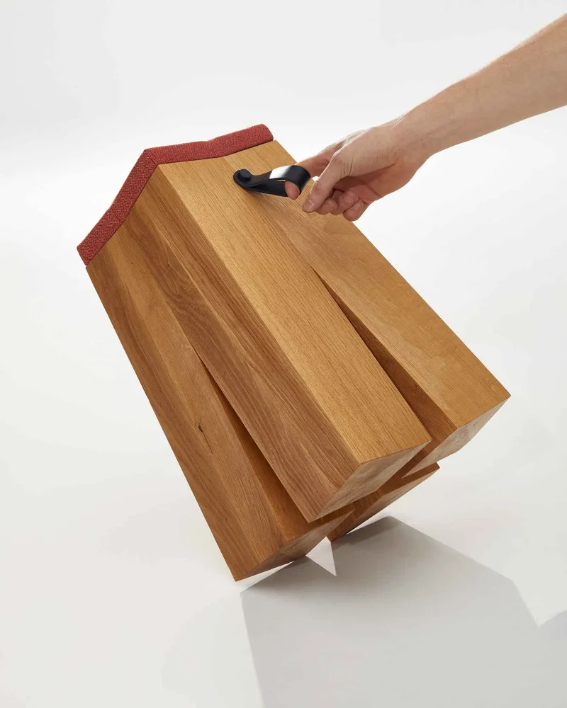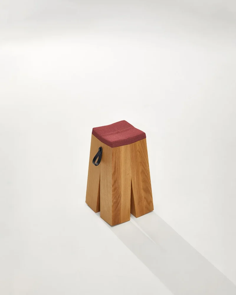 The random constellation of squared timbers leaning against each other at an angle reminds the designer of the tower with the steepest incline in the world, Capital Gate in Abu Dhabi, by RMJM Architects and ADNEC, Abu Dhabi National Exhibition Centre. HAPPENS upholstered stool is the result of playing with the concept of inclined towers. 4 slanted, skilfully balanced stool legs create a stable seat on the hand-sewn fabric upholstery. The weighty stool sculpture Can easily be carried through life by the leather handle firmly anchored in the solid wood.