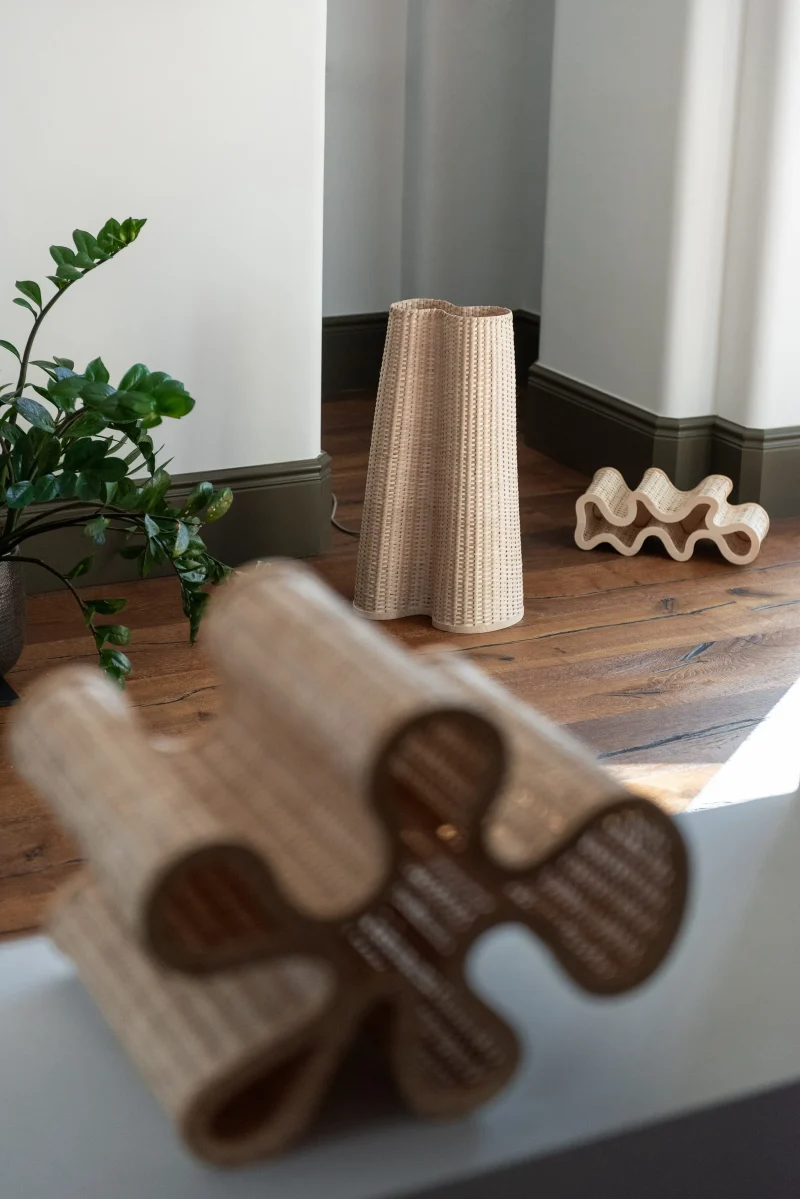 The wooden forms are lightly softened by a series of elegant interwoven folds, which, like a pleated fabric, wrap and drape.