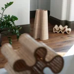 The wooden forms are lightly softened by a series of elegant interwoven folds, which, like a pleated fabric, wrap and drape.
