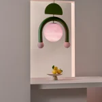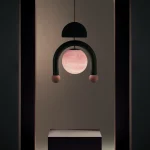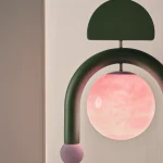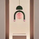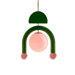 The pendant light Hecate consists of a pink-pigmented glass sphere, over which a dark green ceramic tube forms an arch. At the ends of the arch, there are two pink-painted ceramic spheres. Above the arch, there is another dark green ceramic shape. All the ceramic colours have a matte finish. A suspension tube made of sturdy iron, coloured in gold-silver, keeps the lamp stable and secure, with the length of the suspension being adjustable. The pendant lamp Hecate was handcrafted, making each piece a unique item. Due to this individual manufacturing, the lamps may vary in material and surface from the model shown in the photos. The weight may vary by 1-2 kg, as it is a handmade product.