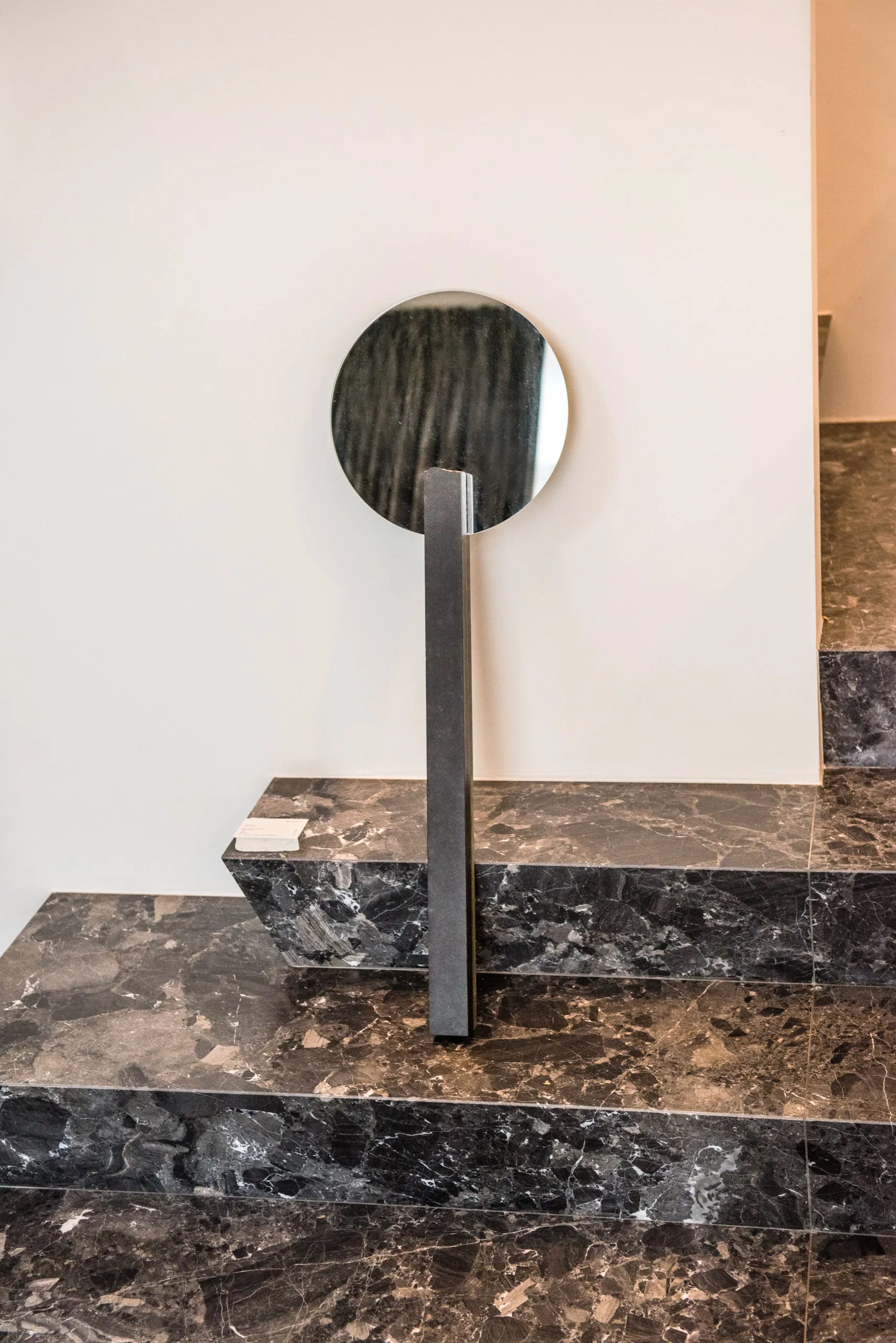 – petit granit (marble), clear mirror, mdf, leather, reclaimed from Obumex’ production workshop