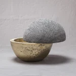 HEMISFERIO is a table lamp composed of a sand-cast bronze base and a hand-carved volcanic stone top. The piece contains an LED light source inside the top, which reflects on the inside of the bronze base to emit indirect ambient light. The lamp contains a pivot point that opens and closes the sphere. It is an abstraction of Ecuador as the middle of the world, representing the equatorial line. It proposes to maintain a view towards the South, the northern hemisphere in stone and our southern hemisphere in bronze.