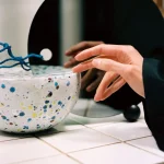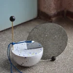 The radical vanity mirror from Romanian-based UAU Studio is an avant-garde fusion of utility and artistic expression. This striking piece features a round mirror affixed to a speckled, ceramic half-sphere base, reminiscent of a celestial planet. Infused with playful space-age elements, this mirror challenges conventional aesthetics, inviting you to embark on a journey of exploration with every glance into its reflective surface. Elevate your daily routine with this innovative and captivating addition to your space, where functionality and imagination converge seamlessly.