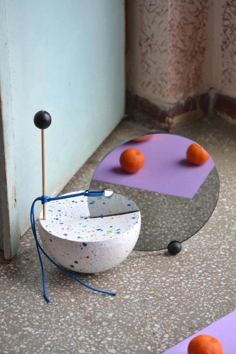 The radical vanity mirror from Romanian-based UAU Studio is an avant-garde fusion of utility and artistic expression. This striking piece features a round mirror affixed to a speckled, ceramic half-sphere base, reminiscent of a celestial planet. Infused with playful space-age elements, this mirror challenges conventional aesthetics, inviting you to embark on a journey of exploration with every glance into its reflective surface. Elevate your daily routine with this innovative and captivating addition to your space, where functionality and imagination converge seamlessly.
