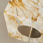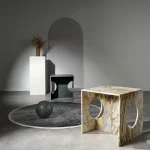A study in geometric harmony and material richness, Hera Table merges architectural precision with sculptural fluidity. Its cube-like structure, punctuated by circular cutouts, creates a dynamic interplay of solid and negative space, enhancing both lightness and presence.