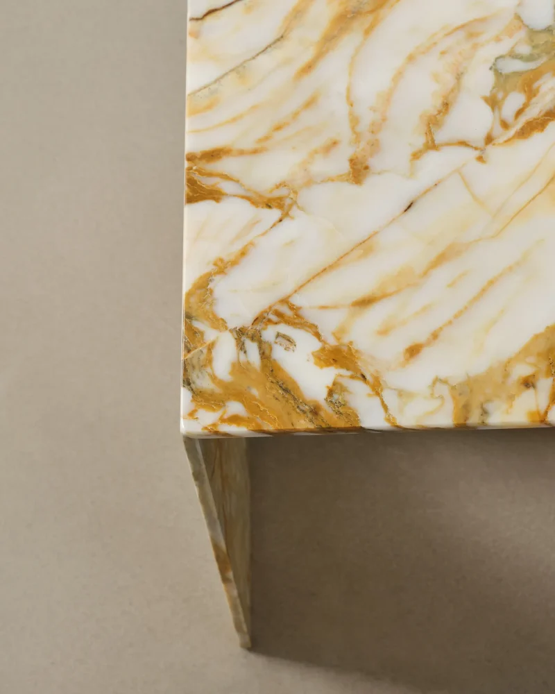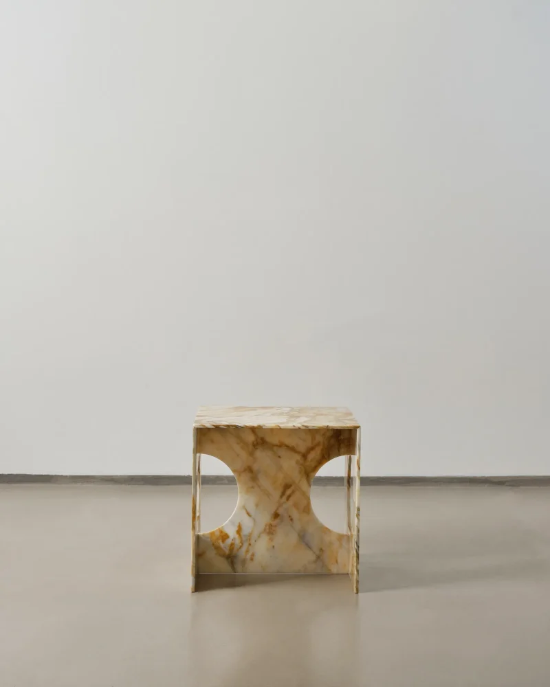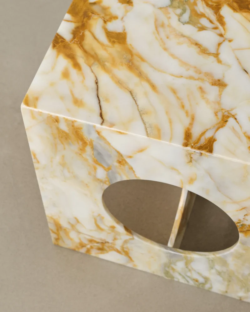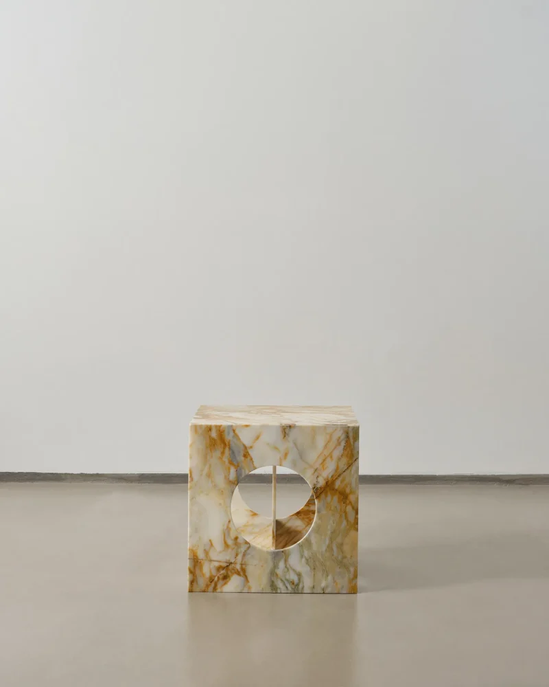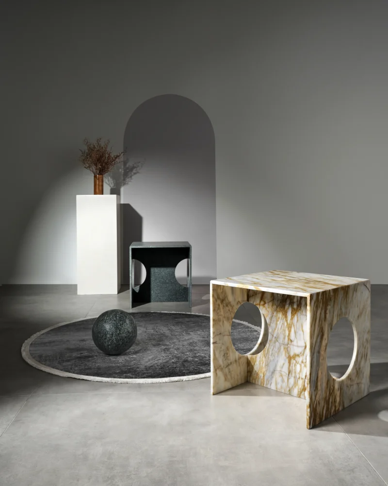 A study in geometric harmony and material richness, Hera Table merges architectural precision with sculptural fluidity. Its cube-like structure, punctuated by circular cutouts, creates a dynamic interplay of solid and negative space, enhancing both lightness and presence.