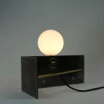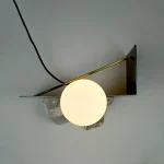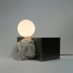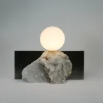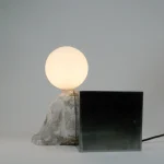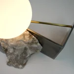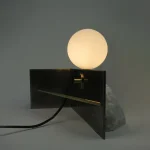 This lamp symbolizes the full moon rising above snow-capped peaks. Positioned vertically, it captures the view from below, where the moon hovers like a serene guardian over the landscape. The brass pipe adds a dynamic accent, breaking the gray tones and energizing the composition. Minimal “L” shaped lines in the background enhance the modern architectural feel, creating a harmonious blend of natural and structured elements, where ancient landscapes meet contemporary design.