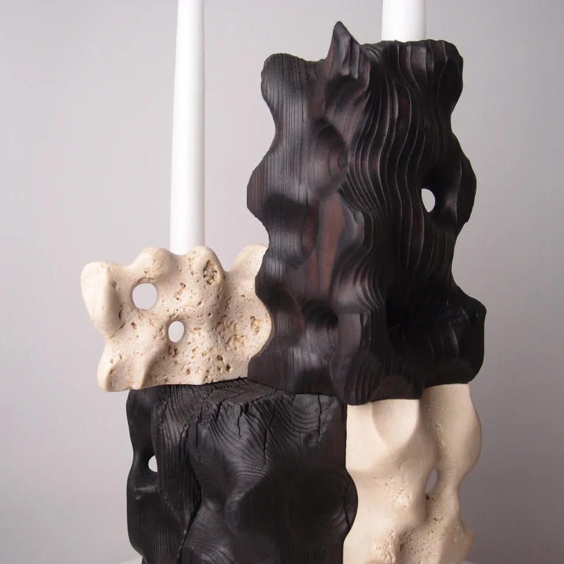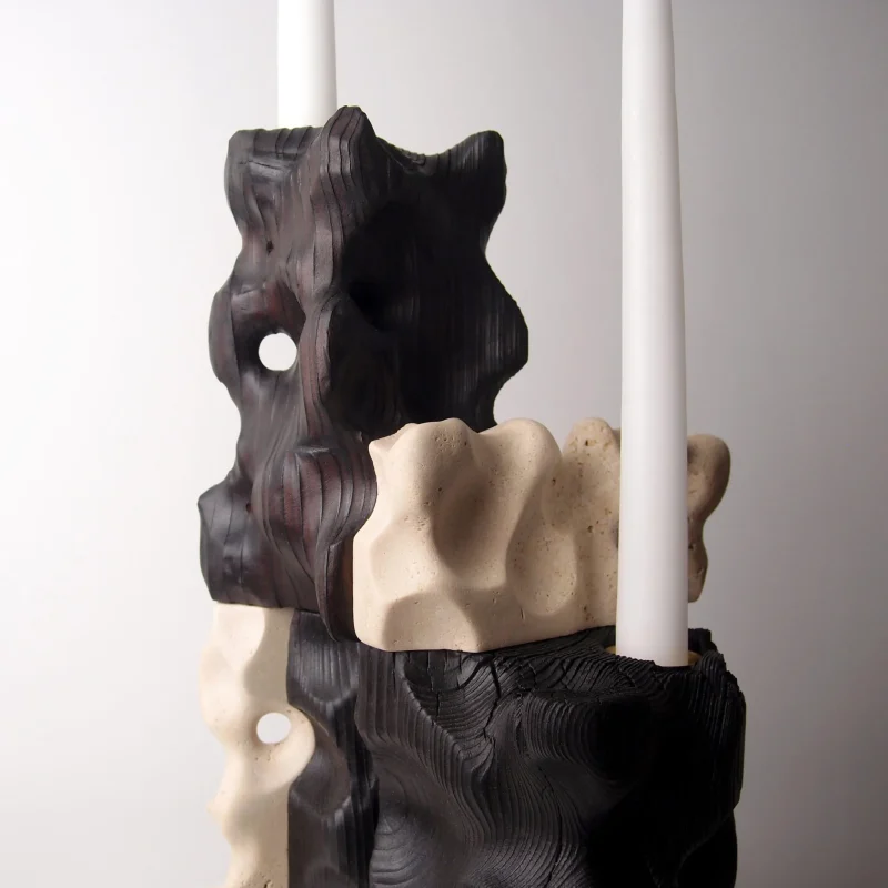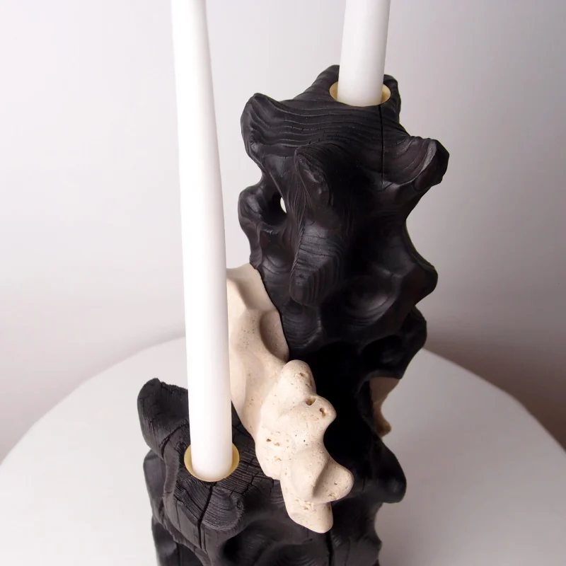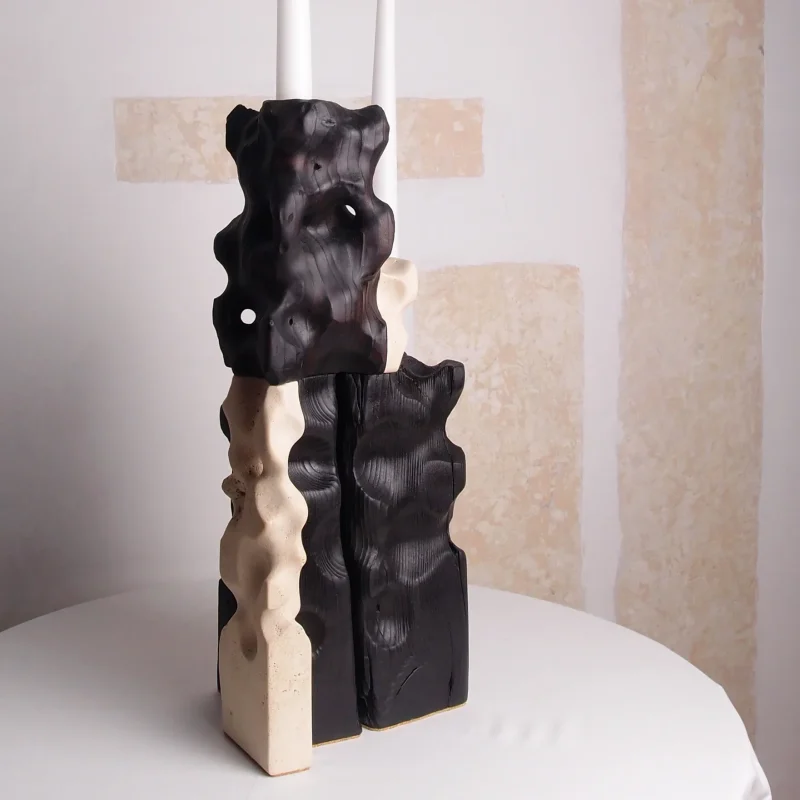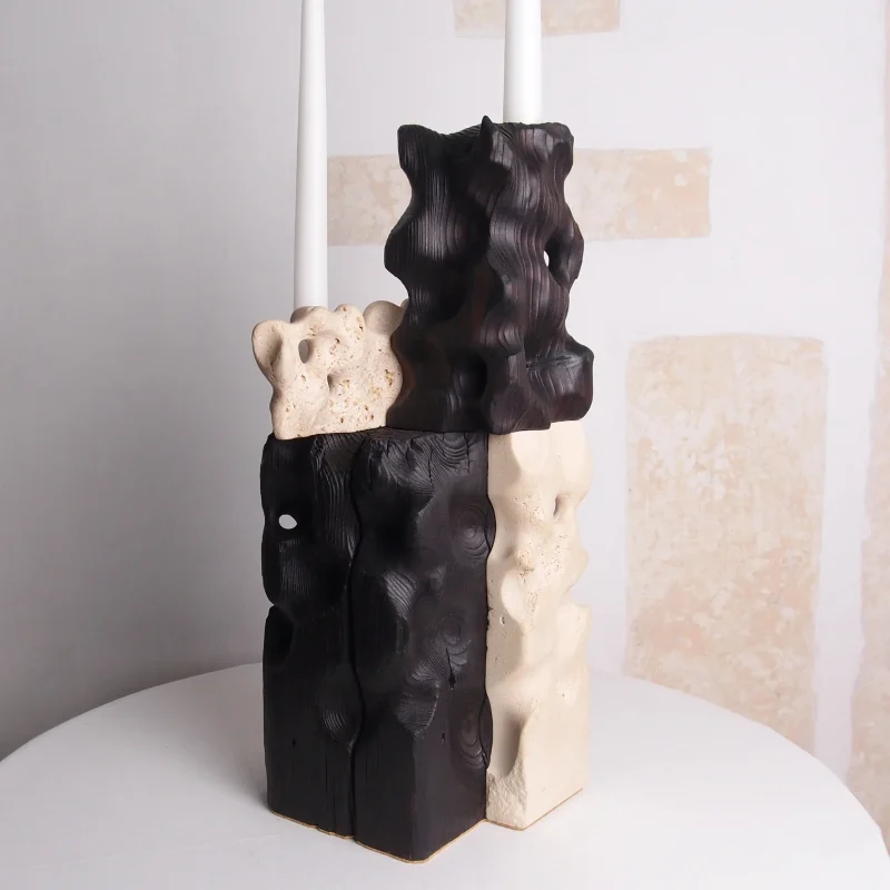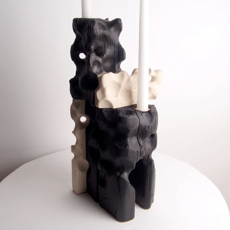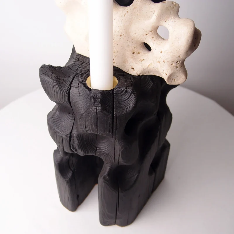 This artfully sculpted candle holder is a testament to innovative reuse, handcrafted from repurposed beam wood and remnants of pristine white stone. With delicate precision, I’ve enhanced the wood using the traditional Japanese Yakisugi method, and it’s then elegantly finished with natural oils and sealed with beeswax. Beneath, a subtle cork lining ensures your surfaces remain pristine.