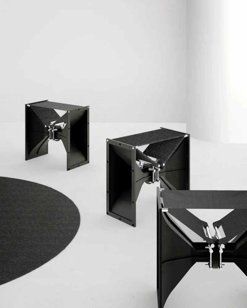 ‘Horn Series’ is a project that reinterprets the form and structure of the speaker horn—a relic of industrial civilization now considered functionally obsolete. By uncovering new functional possibilities and reconstructing them into everyday furniture, this project breathes new life into forgotten objects. Through this exploration, ‘Horn Series’ aims to challenge fixed perceptions of function and image, encouraging audiences to transcend the limits of self-awareness and memory. It invites them to experience a shift in perspective, discovering the unexpected in the familiar.