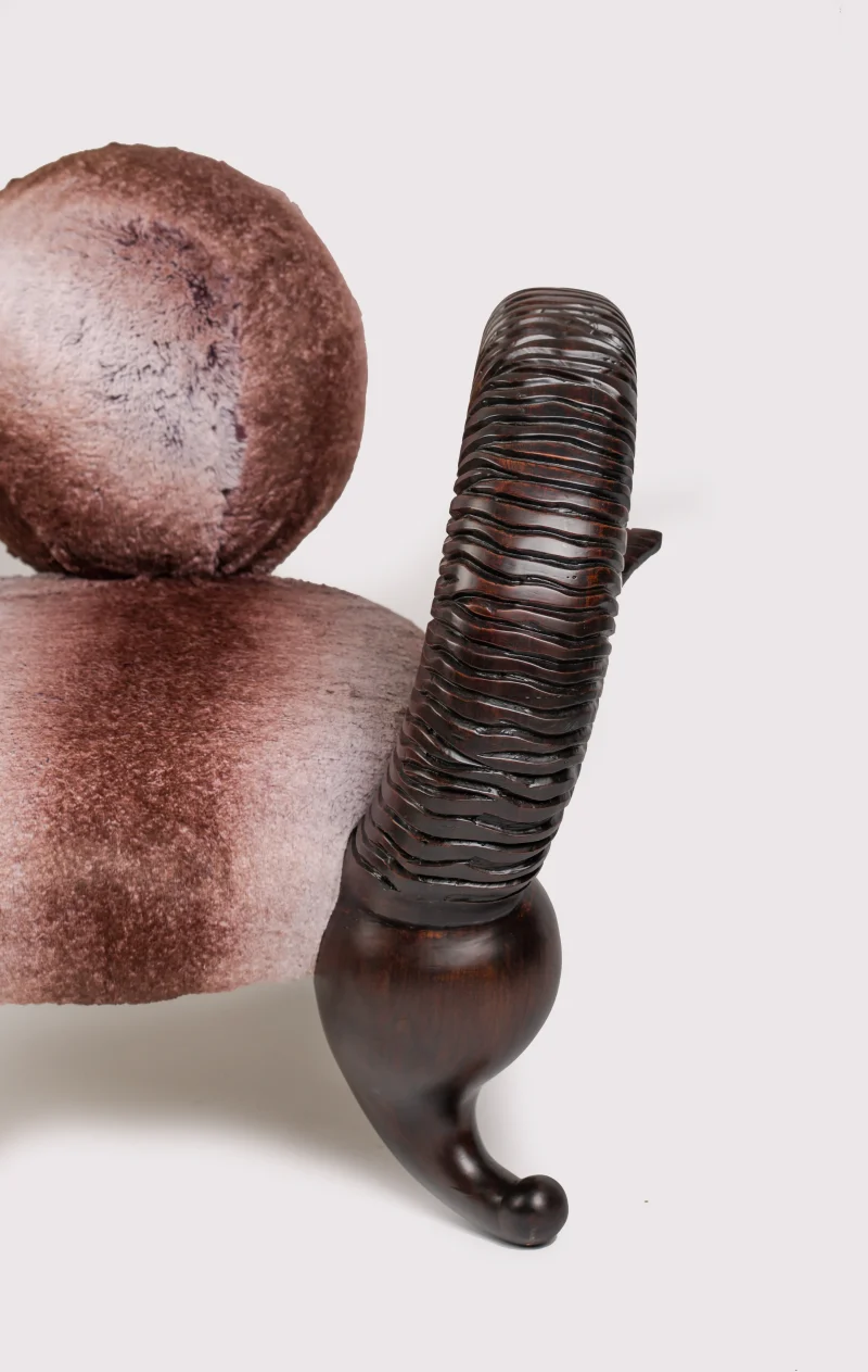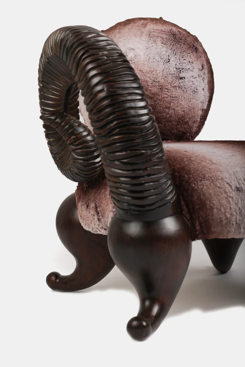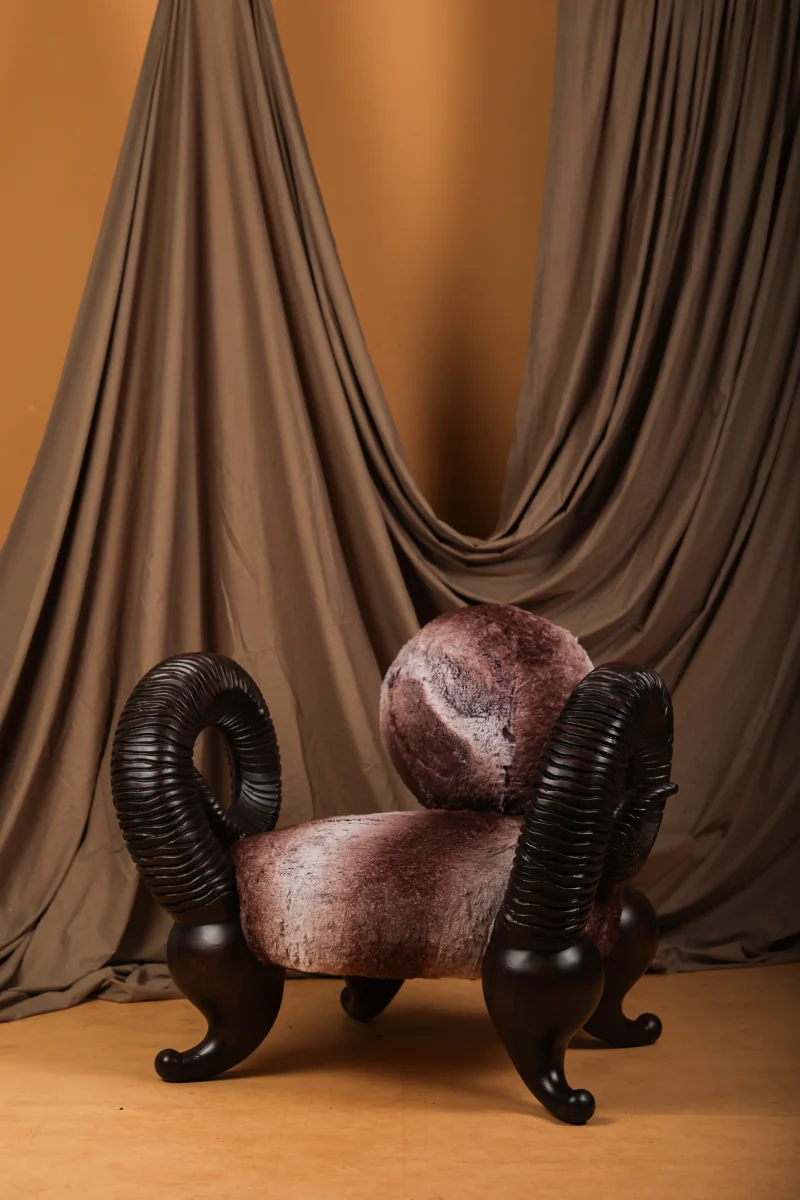 The design features striking armrests reminiscent of ram’s horns, a rounded faux fur backrest for unparalleled comfort, and gracefully sculpted kuiri-style legs. Crafted from sustainably sourced teakwood and premium faux fur, the Horned Majesty aligns with ethical and eco-conscious principles while offering lasting durability and ergonomic support.