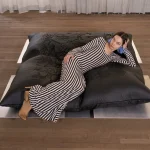 The daybed is revealing its function of use more easily, because of the large soft pillow on top of the aluminium base. The lower level of the base forms a mould for the pillow to fall into and support your lower back.