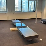 The slidable bench can be presented and transformed in multiple ways. The two stainless steel covers slide off to form a new object that can serve as a small side table, or an additional seat using one of the covers.