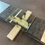 Tervoux, stainless steel, glass, embroidered leather, foam, steel, resin.