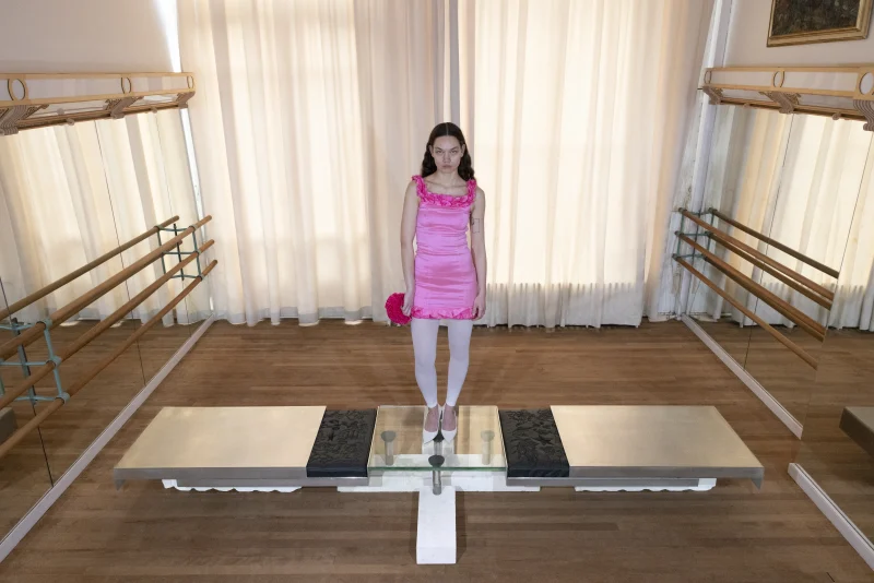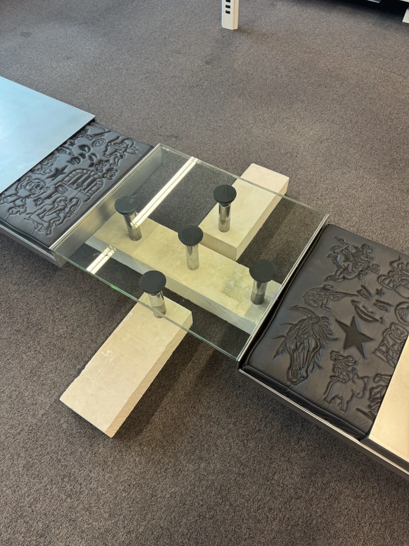 Tervoux, stainless steel, glass, embroidered leather, foam, steel, resin.