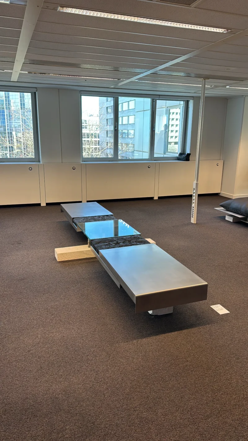 The slidable bench can be presented and transformed in multiple ways. The two stainless steel covers slide off to form a new object that can serve as a small side table, or an additional seat using one of the covers.