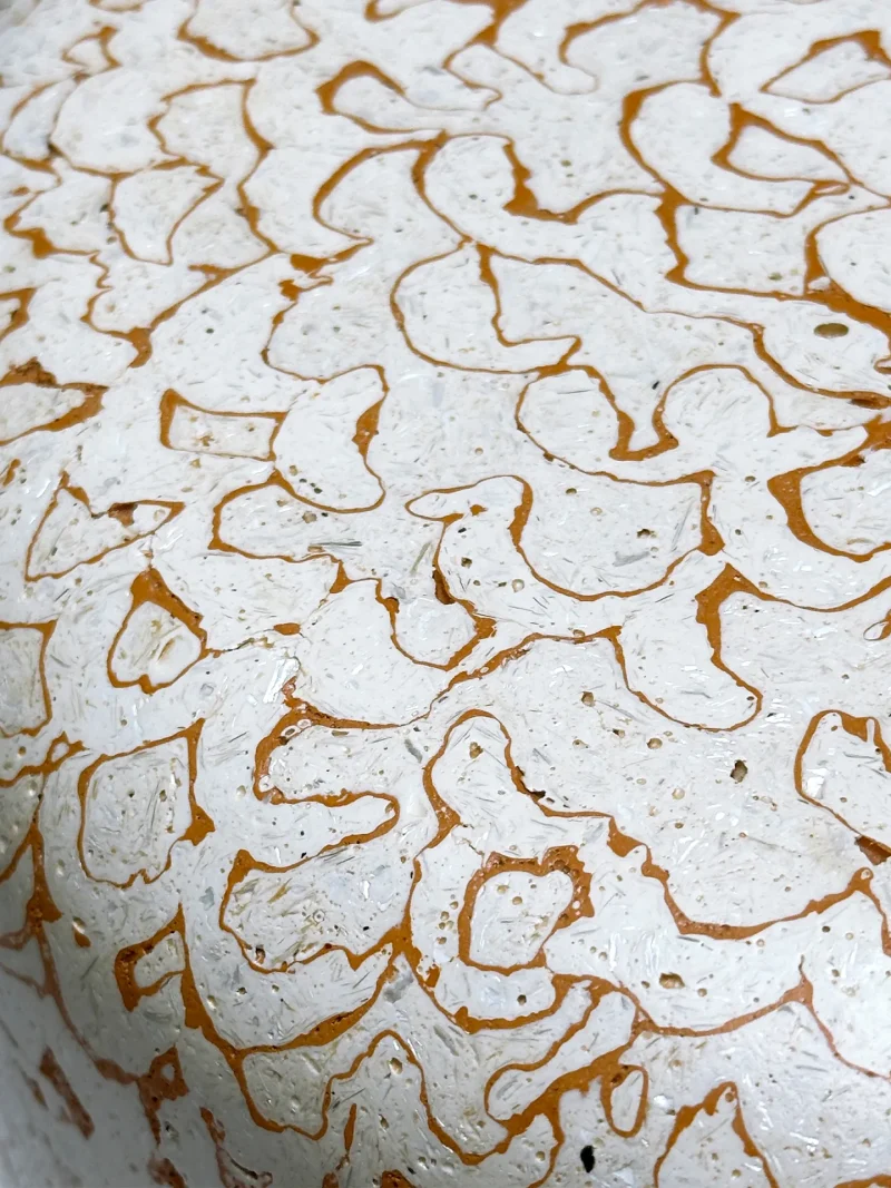 The HRISANTEMA surface from the lime plaster series by Martina Dimitrova is thoughtfully crafted to capture the timeless allure of flower petals. Drawing inspiration from the exuberant and ornate Rococo aesthetic, HRISANTEMA presents a contemporary reinterpretation of floral motifs onto simple and bold shapes. Each object boasts a distinct and organic pattern, evoking the rhythmic and rotational symmetry observed in nature.