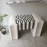 Expanding on the modular and structural properties of the HUI tiles, we applied an architectural approach to the design of the HUI bench. This bench leverages the inherent strength and versatility of the tiles, resulting in a dynamic yet stable composition. By exploring the relationship between furniture and architecture, the design highlights the adaptability of the HUI tiles in forming a functional and sculptural piece. The bench exemplifies a fusion of aesthetic elegance and sustainable material use, reinforcing the potential of modular design in larger architectural contexts.