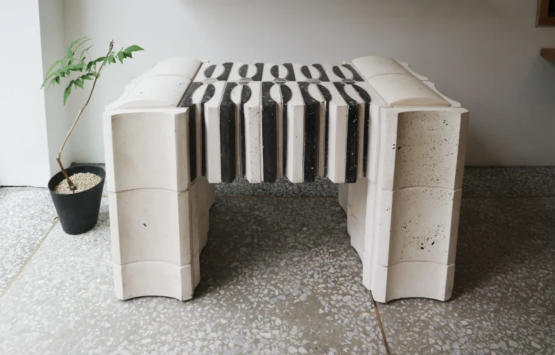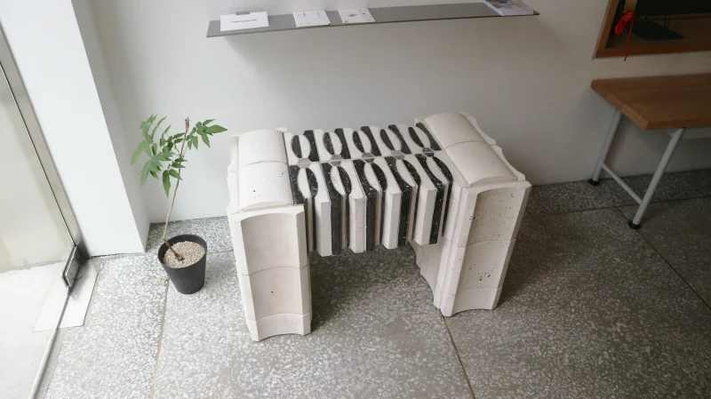Expanding on the modular and structural properties of the HUI tiles, we applied an architectural approach to the design of the HUI bench. This bench leverages the inherent strength and versatility of the tiles, resulting in a dynamic yet stable composition. By exploring the relationship between furniture and architecture, the design highlights the adaptability of the HUI tiles in forming a functional and sculptural piece. The bench exemplifies a fusion of aesthetic elegance and sustainable material use, reinforcing the potential of modular design in larger architectural contexts.