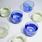 Shallow drinking glasses. Hypnosis glasses are hand-blown in Istanbul using the Cesm-i bulbul technique. It’s a distinguished method deeply rooted in Turkish glassmaking with origins tracing back to the Ottoman Empire. During the 18th century, artists sent to Venice refined and perfected the Filigrana technique, giving rise to Çeşm-i Bülbül as a distinctive style characterized by its repetitive and delicate droplet-shaped motifs. The significance of the Çeşm-i Bülbül technique lies in its demand for a high level of craftsmanship and experience. Mastery is required to align very thin and colored glass sticks precisely while preventing their fusion, all while shaping the object to its final form.