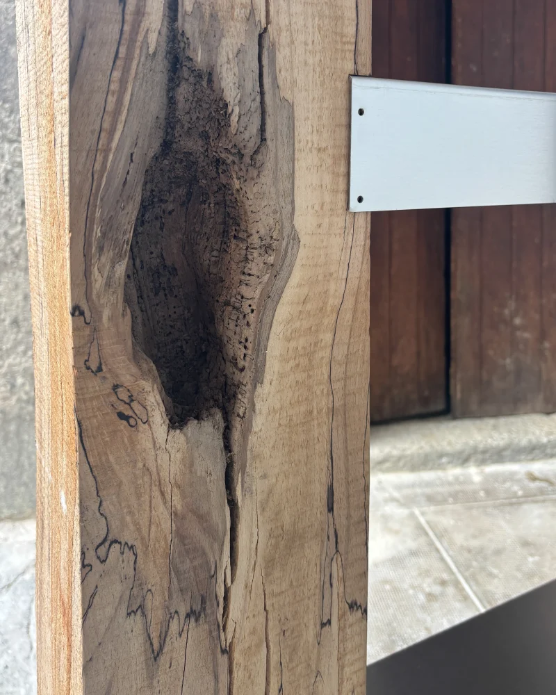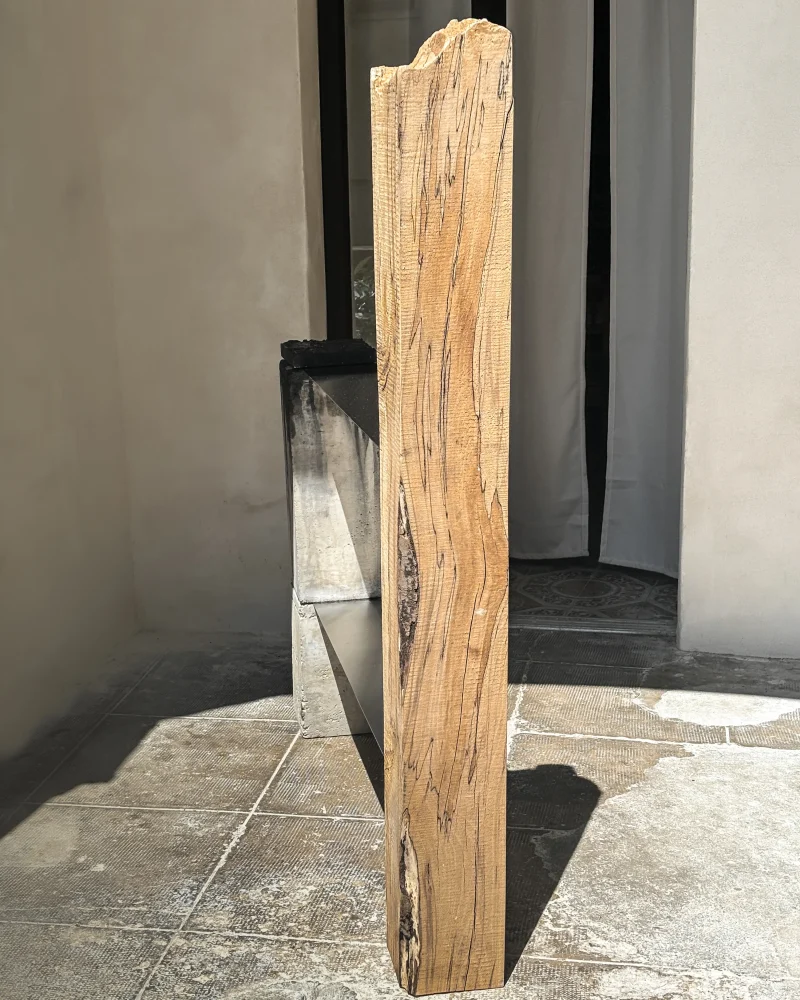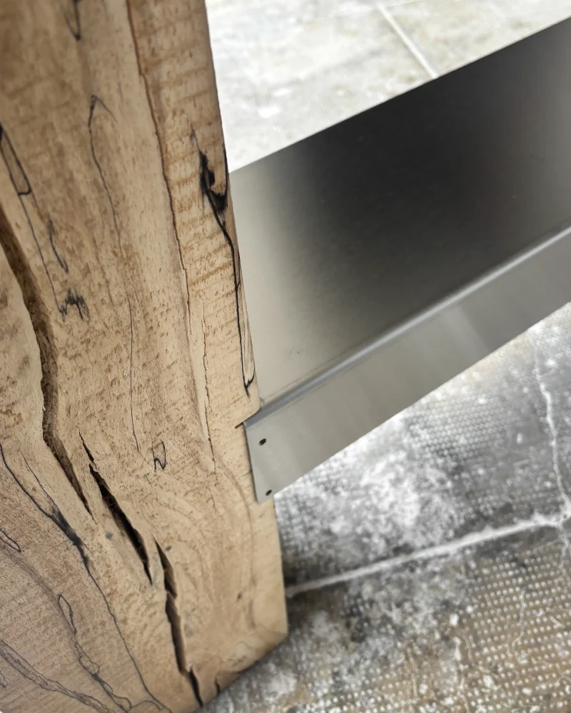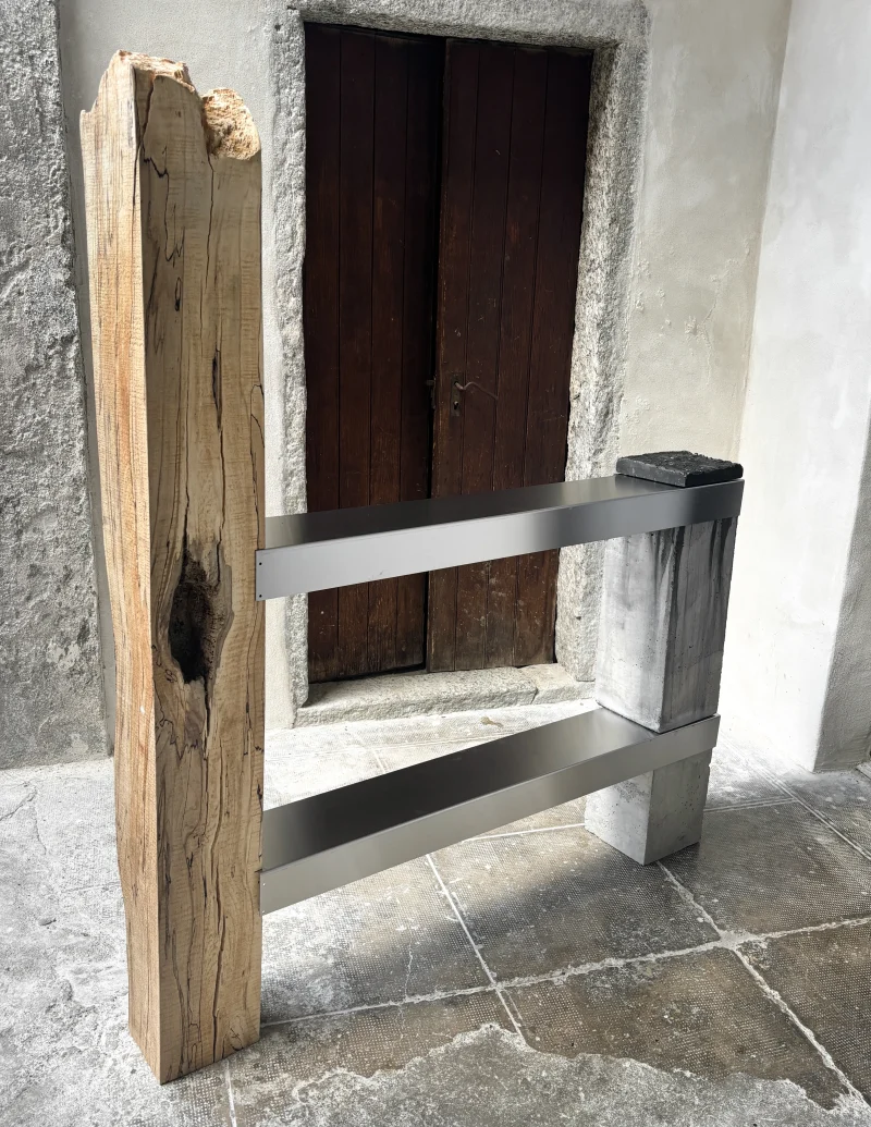 Ice Beech Center Piece, that holds Stainless Steel Shelves – counter parted with a Stained Concrete Column, split into three parts.