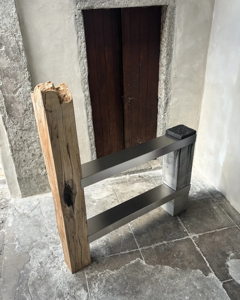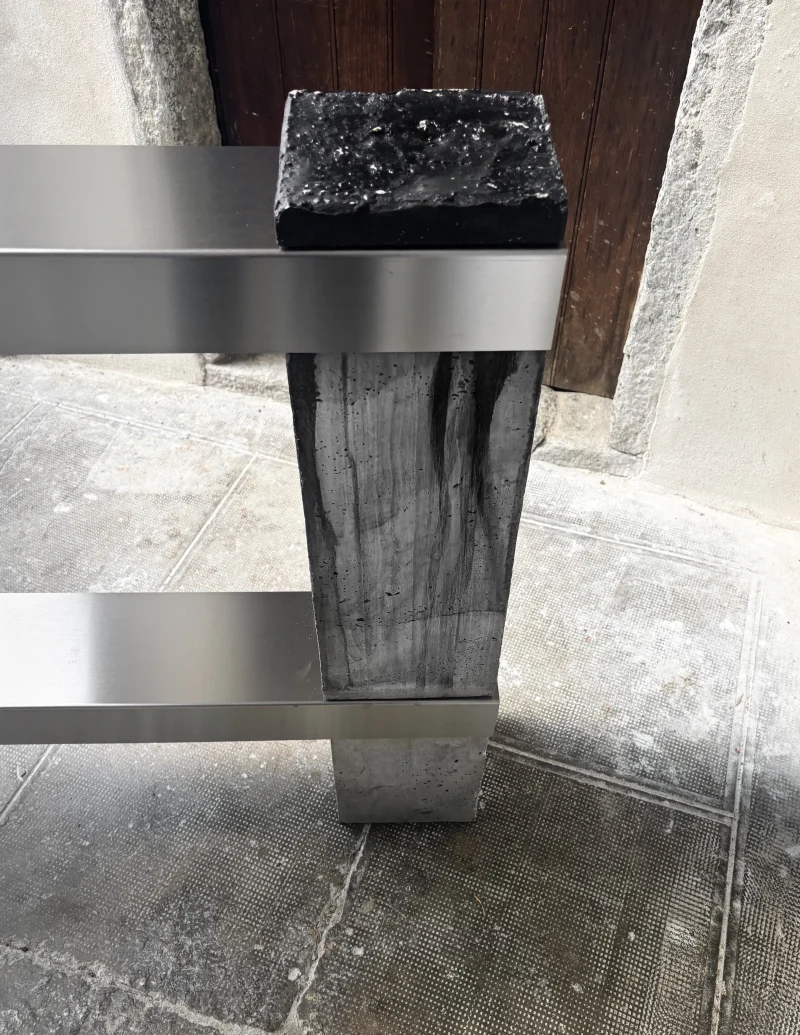 Devoted to the intentional use, curation and finishing of unique and long lasting materials we created new collectible design objects, including this Ice Beech Sideboard. The main focus was on creating objects that both reshape and highlight the initial features of the certain material. For the main part of the sideboard we sourced a precious wood called Ice Beech (“Truffle Beech”), that has a characteristic dark/black swirling grain, due to unique ageing and its interaction with the surrounding. This structure is again referenced in a counterparted element of the object: Stained Concrete, that due to a unique finish resembles that natural and unique gradient/swirl in a modern and artificial way.