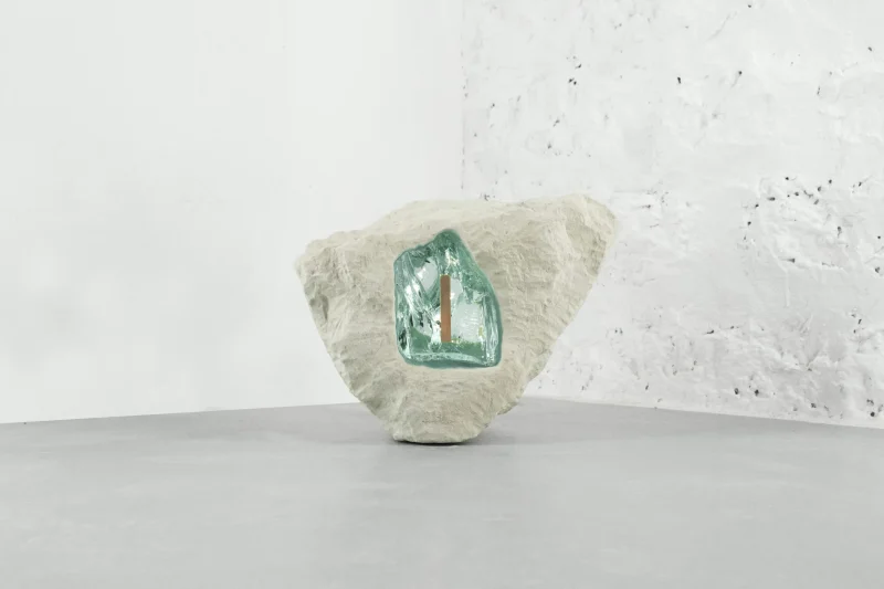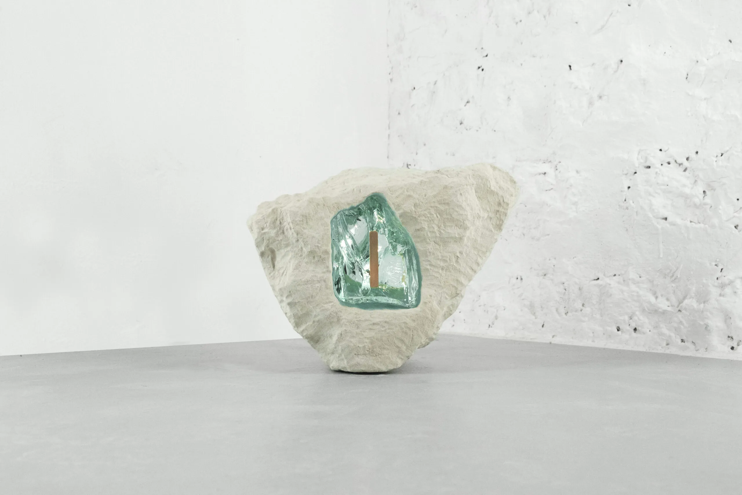 “Ice Totem” is part of the “Precious Artefact” capsule collection of light sculptures by Audrey Guimard and Marie Jeunet. On sculptural stone plinths, like so many mineral landscapes, are integrated sheets of coloured glass and blocks of raw material which, through skilful play of lights and textures, magnify the stone and the surfaces surrounding them. Coloured transparencies and hypnotic caustics evolve before our eyes throughout the day.