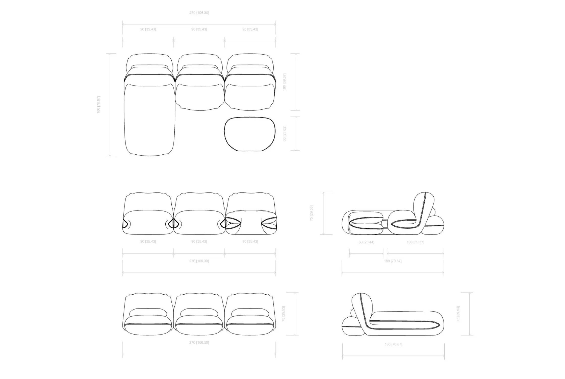 You can combine the curved modular sofa with a loveseat, lounge chair, armrests and a pouf, see my other pieces. The dimensions and the fabric of the chair can be customized to suit your preferences. You can change the seat depth, standard 55cm or comfort 75cm. And you can create a customized element sofa. Please contact me for more information.