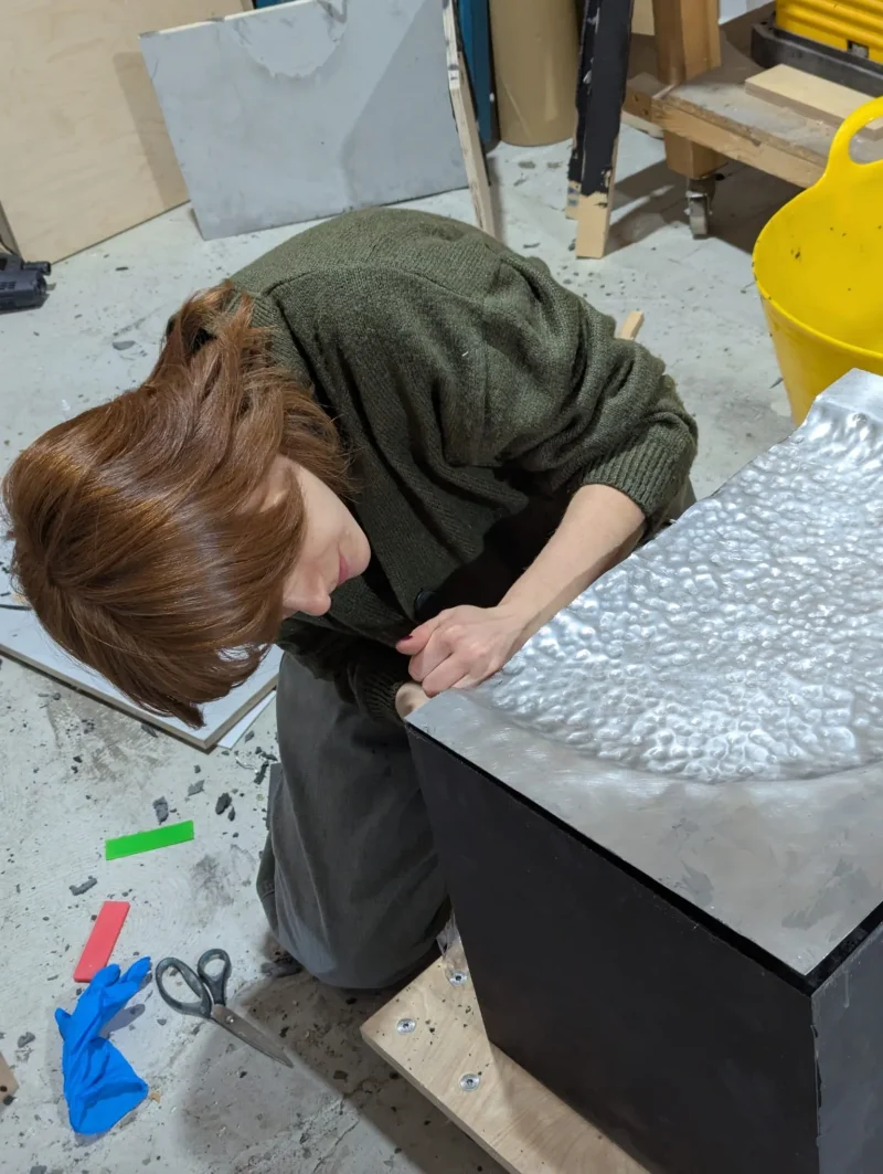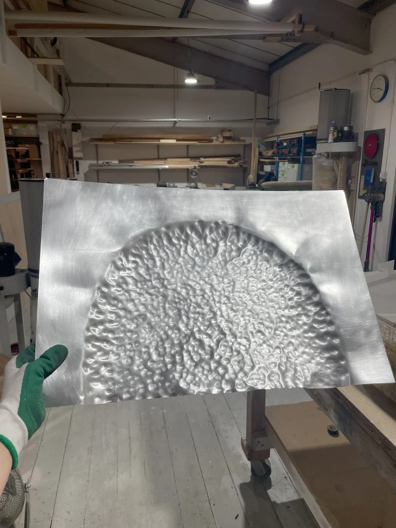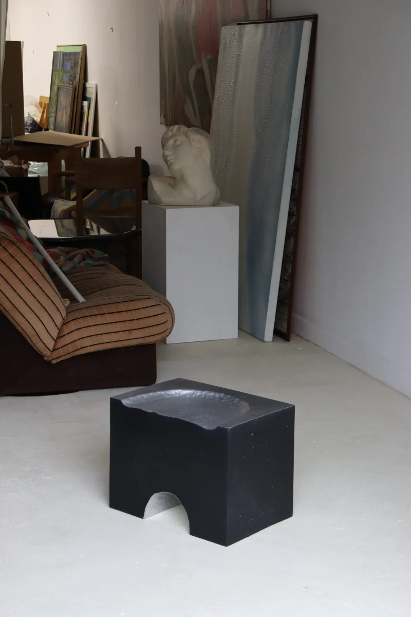 Originally from Italy, Emilia draws inspiration from her Sicilian heritage and the raw, volcanic landscapes that define the island. Her most recent series, ETNA, channels this connection to land and energy. The collection combines hand-hammered aluminium with pigmented jesmonite, using metal sheets as both form and mould. The result is a monolithic, textural piece celebrating material tension, weight, and surface irregularity.