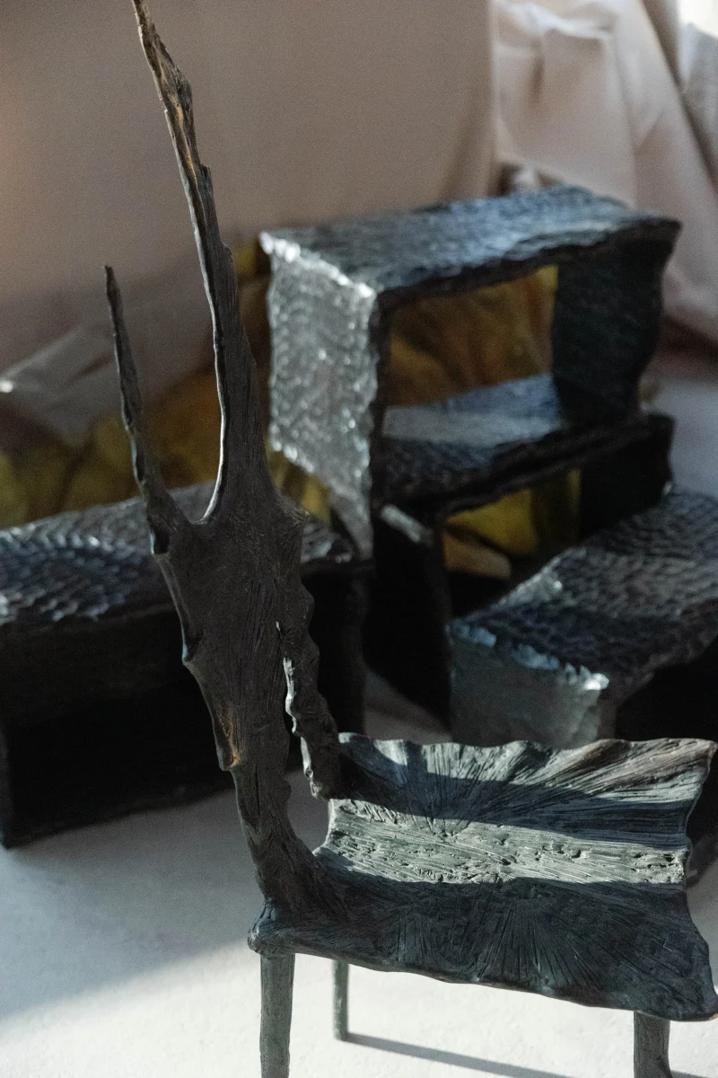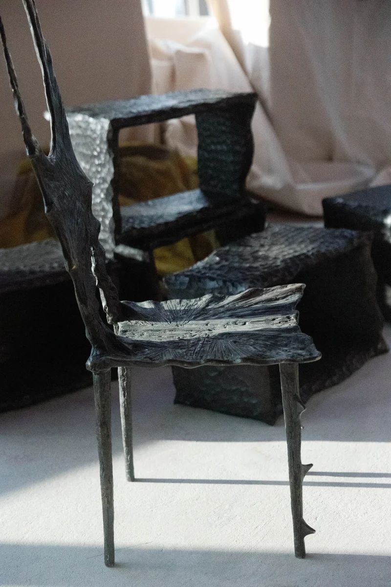 Born from the myth of the Iele, untamed spirits dancing across Romanian fields, this chair becomes an object of desire, movement, and seduction. In collaboration with artist Giulian Dumitriu, the piece embraces a shared pursuit of emotional intensity through form.