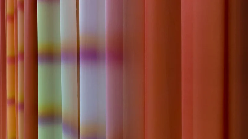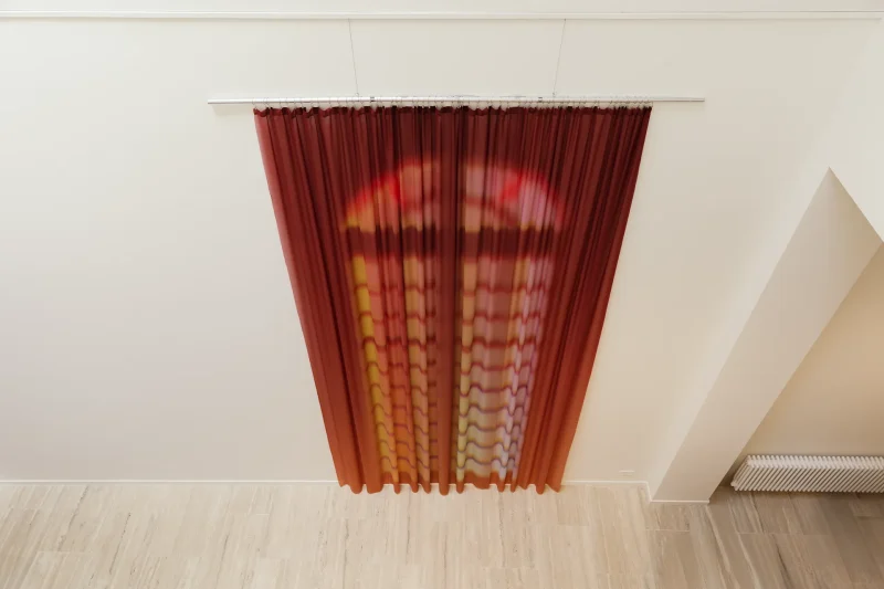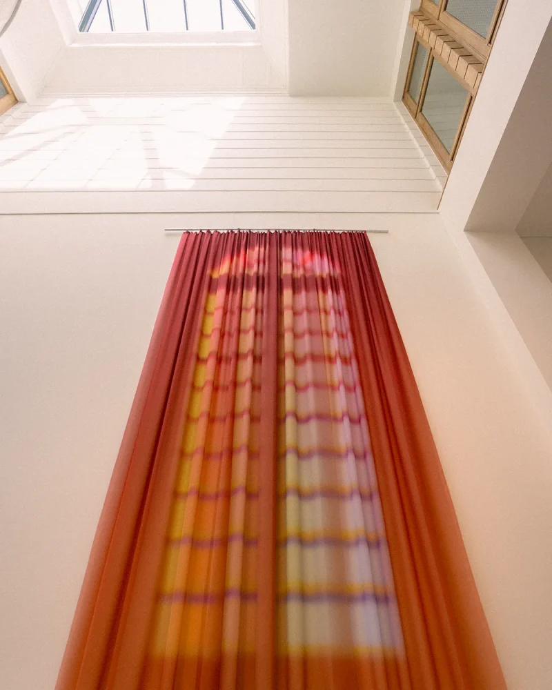 Yvonne Mak’s installation features printed textiles that mimic sun-bleached curtains, shaped by years of sunlight exposure. Faded patterns appear on the fabric, creating the illusion of windows where there are none. This subtle trick of the mind, suggesting more daylight and openness, can enhance feelings of wellbeing and happiness indoors.