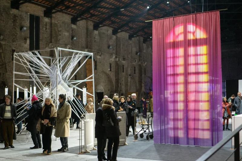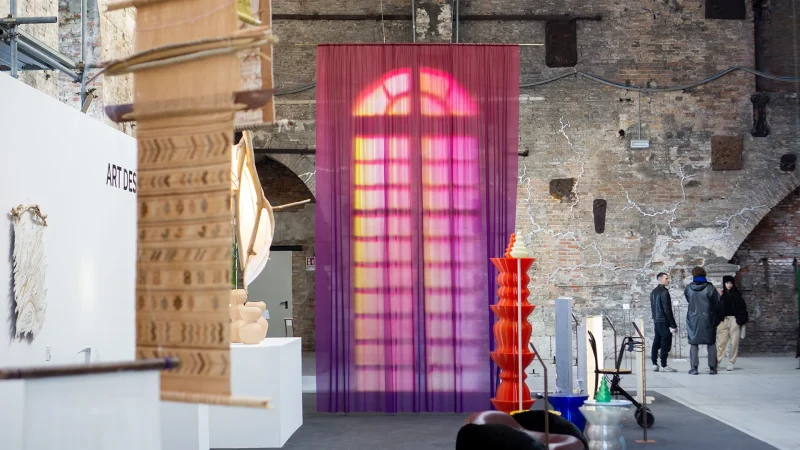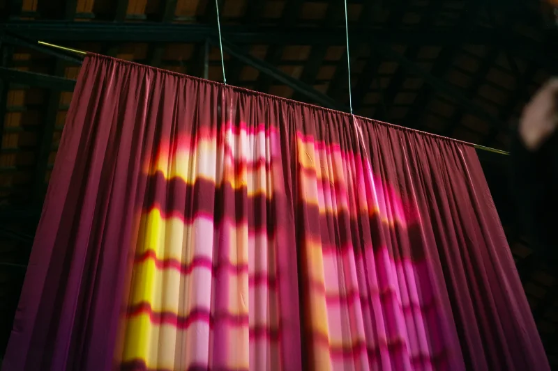 Yvonne Mak’s installation features printed textiles that mimic sun-bleached curtains, shaped by years of sunlight exposure. Faded patterns appear on the fabric, creating the illusion of windows where there are none. This subtle trick of the mind, suggesting more daylight and openness, can enhance feelings of wellbeing and happiness indoors.