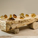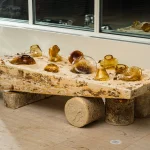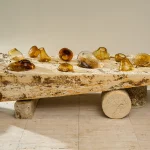 These glass pieces represent ACT II, of a series of events centered around a mycelium table, a collaboration with nature, that started in may 2024. By giving up part of the creative control, allowing nature to shape the design, the mycelium table is an evolving entity that facilitates three ACTs of gathering that compose this piece.