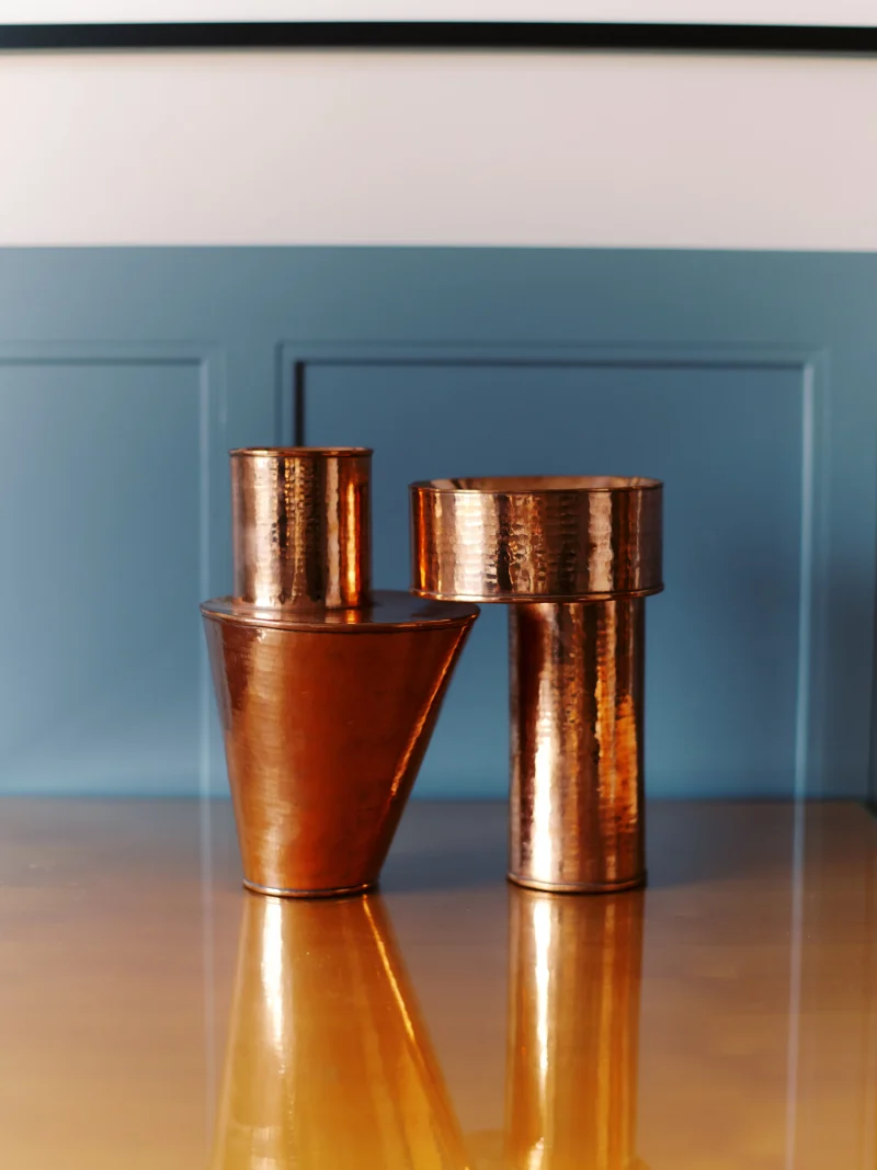 A double walled vase collection made in handmade shaped from hammered copper. Each vase is an intersection of basic geometric volumes with double walls and an air gap in between.