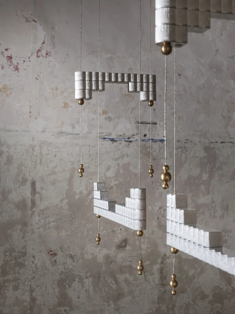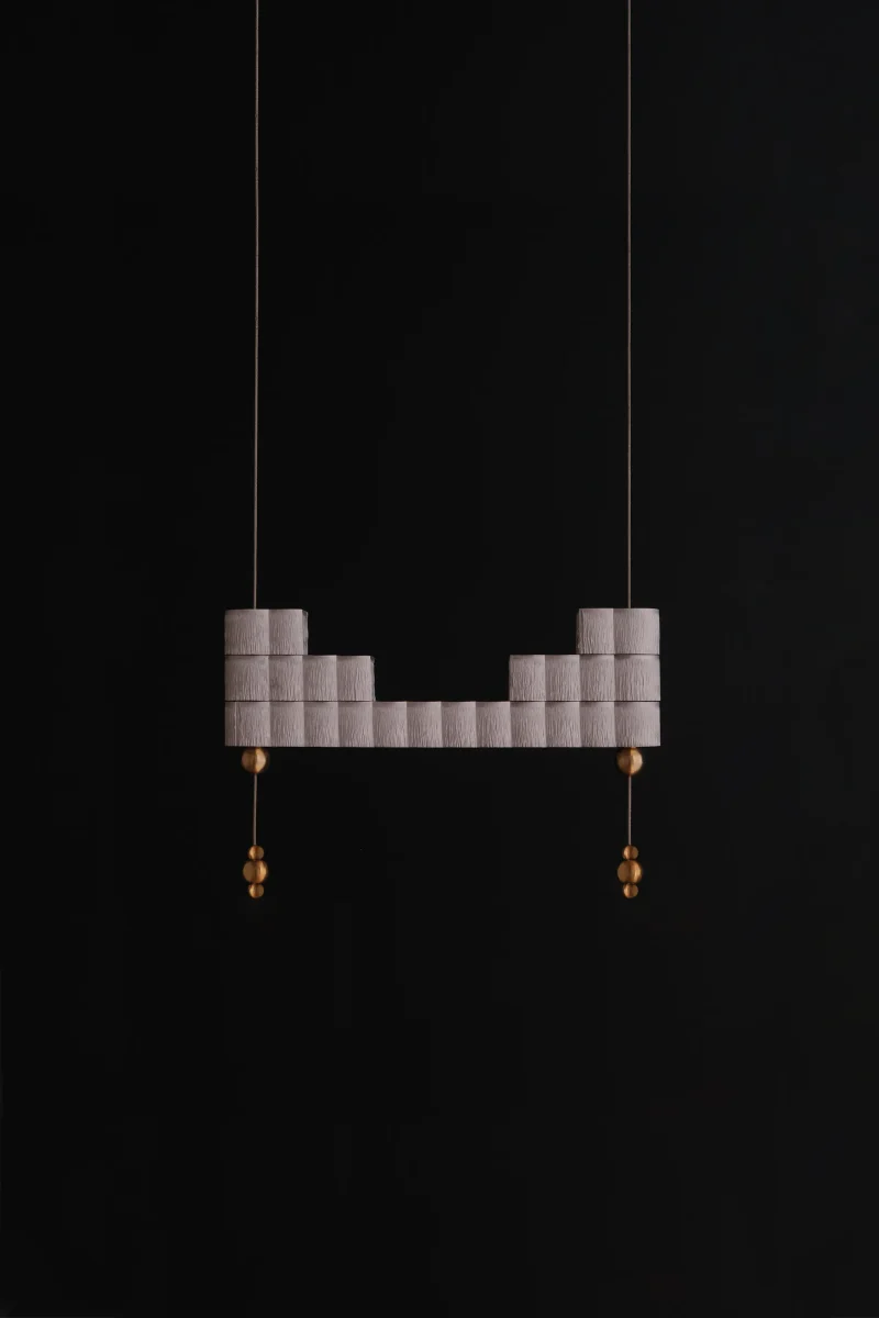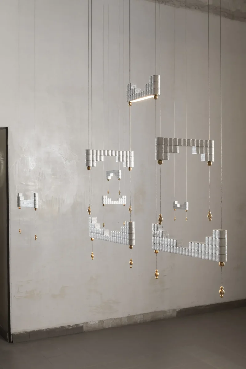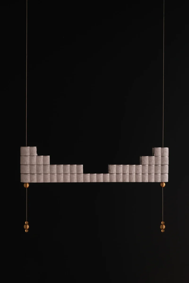 The atelier’s new project is inspired by this ancient object to create a modular lamp, composed of overlapping aluminium bars crossed by suspension cables that electrify the lighting body.