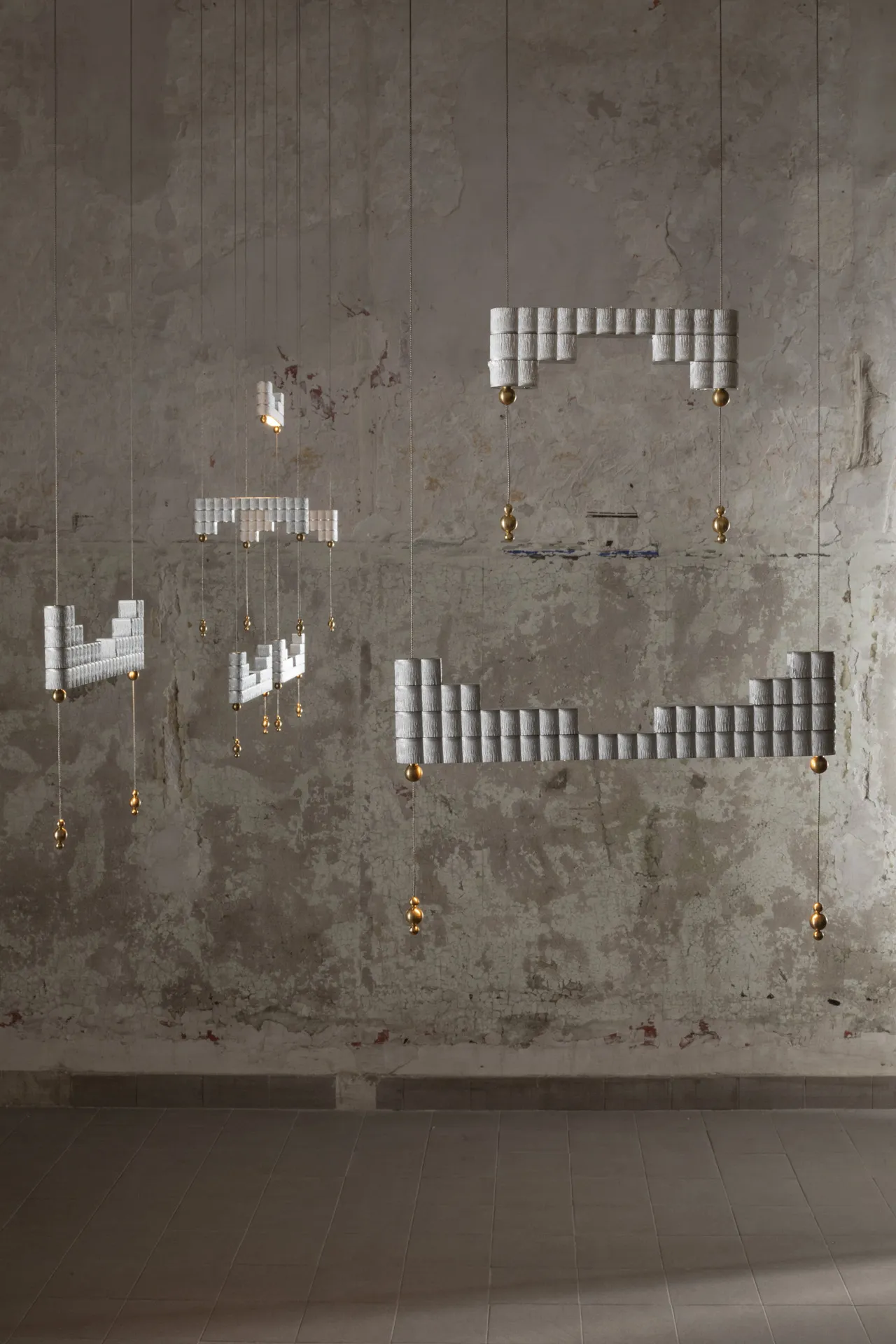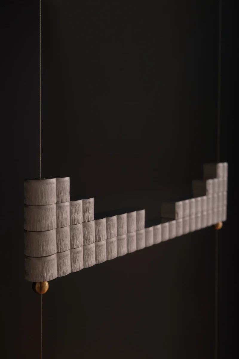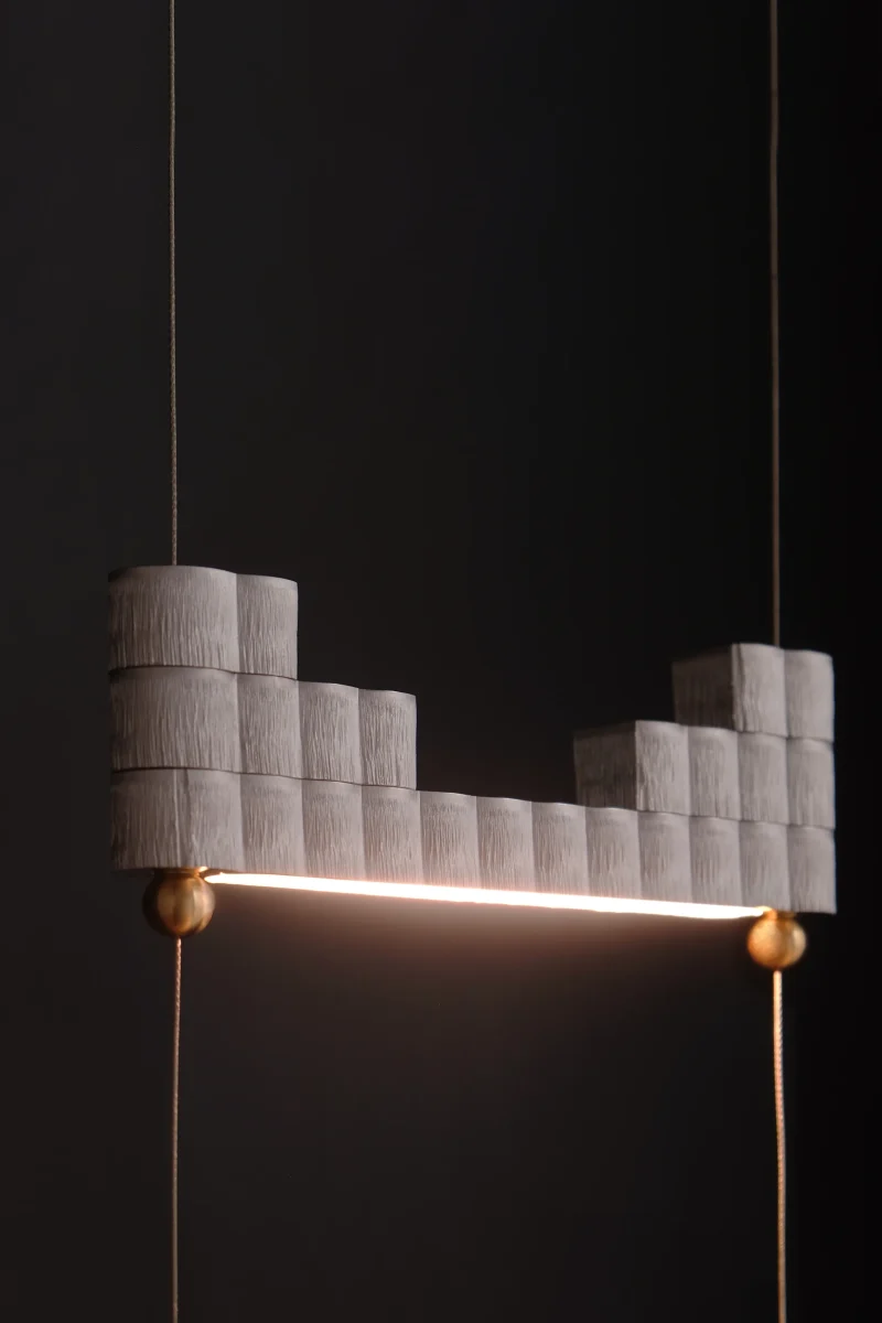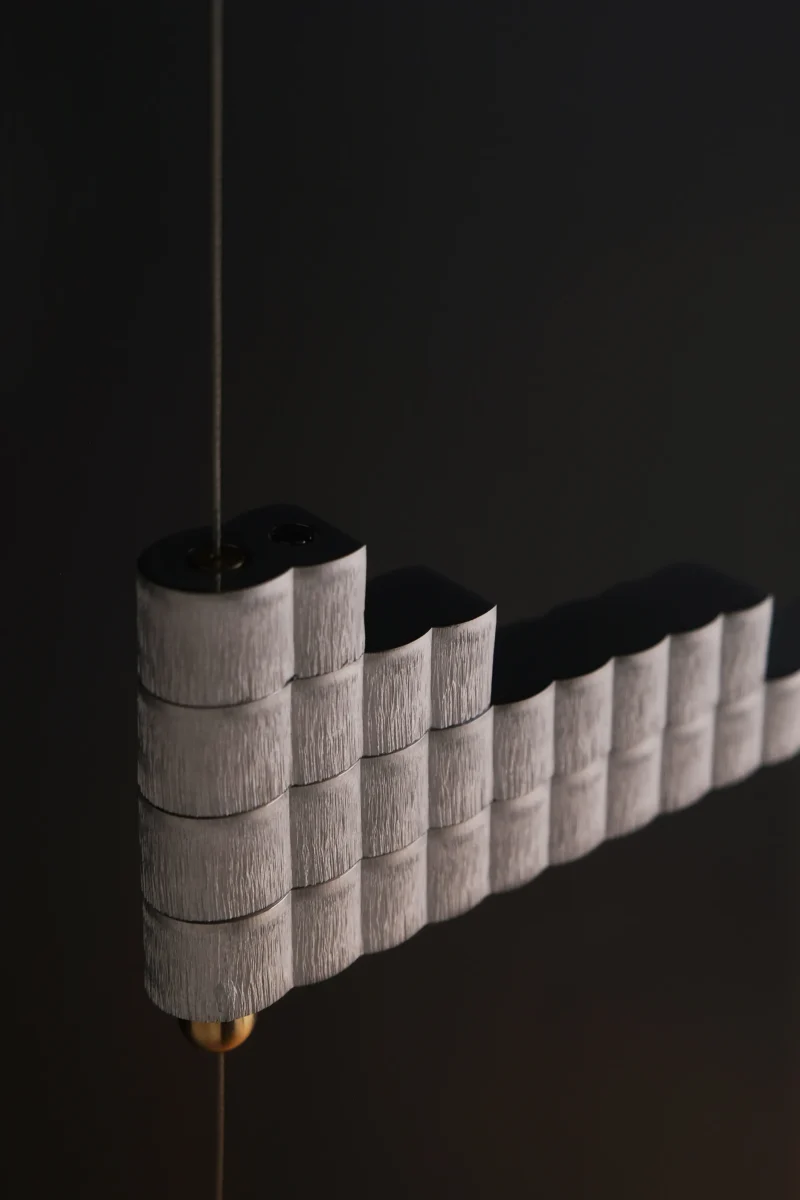 The atelier’s new project is inspired by this ancient object to create a modular lamp, composed of overlapping aluminium bars crossed by suspension cables that electrify the lighting body.