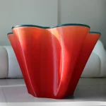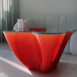 The Interfered coffee table by Nourhan Rabah was first unveiled at Dutch Design Week. Rooted in cultural nuances, it draws inspiration from the dynamics of coffee gatherings, where conversations weave unique narratives. The design features intersecting circles that symbolize the lively exchange of ideas, with its sculptural, wave-like form achieved through cutting-edge 3D printing techniques. Its base showcases a gradient finish, transitioning from rich color at the base to a lighter hue at the top, while a sleek glass top adds refinement. Marrying raw, industrial textures with elegant detailing, the table is a practical centerpiece and a striking statement.