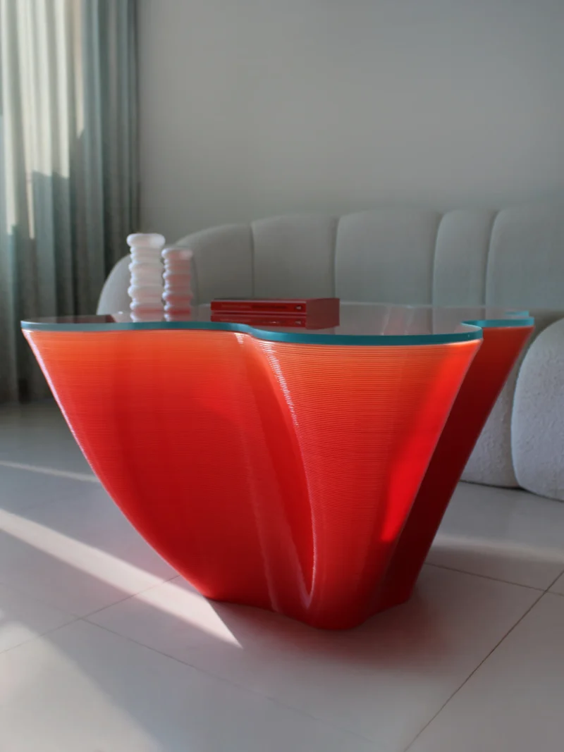 The Interfered coffee table by Nourhan Rabah was first unveiled at Dutch Design Week. Rooted in cultural nuances, it draws inspiration from the dynamics of coffee gatherings, where conversations weave unique narratives. The design features intersecting circles that symbolize the lively exchange of ideas, with its sculptural, wave-like form achieved through cutting-edge 3D printing techniques. Its base showcases a gradient finish, transitioning from rich color at the base to a lighter hue at the top, while a sleek glass top adds refinement. Marrying raw, industrial textures with elegant detailing, the table is a practical centerpiece and a striking statement.