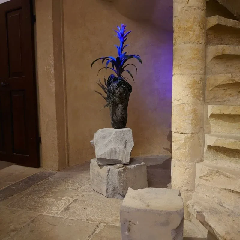 glass, coated with crushed glass, frosted with painter’s glass salt, crackled, live plant