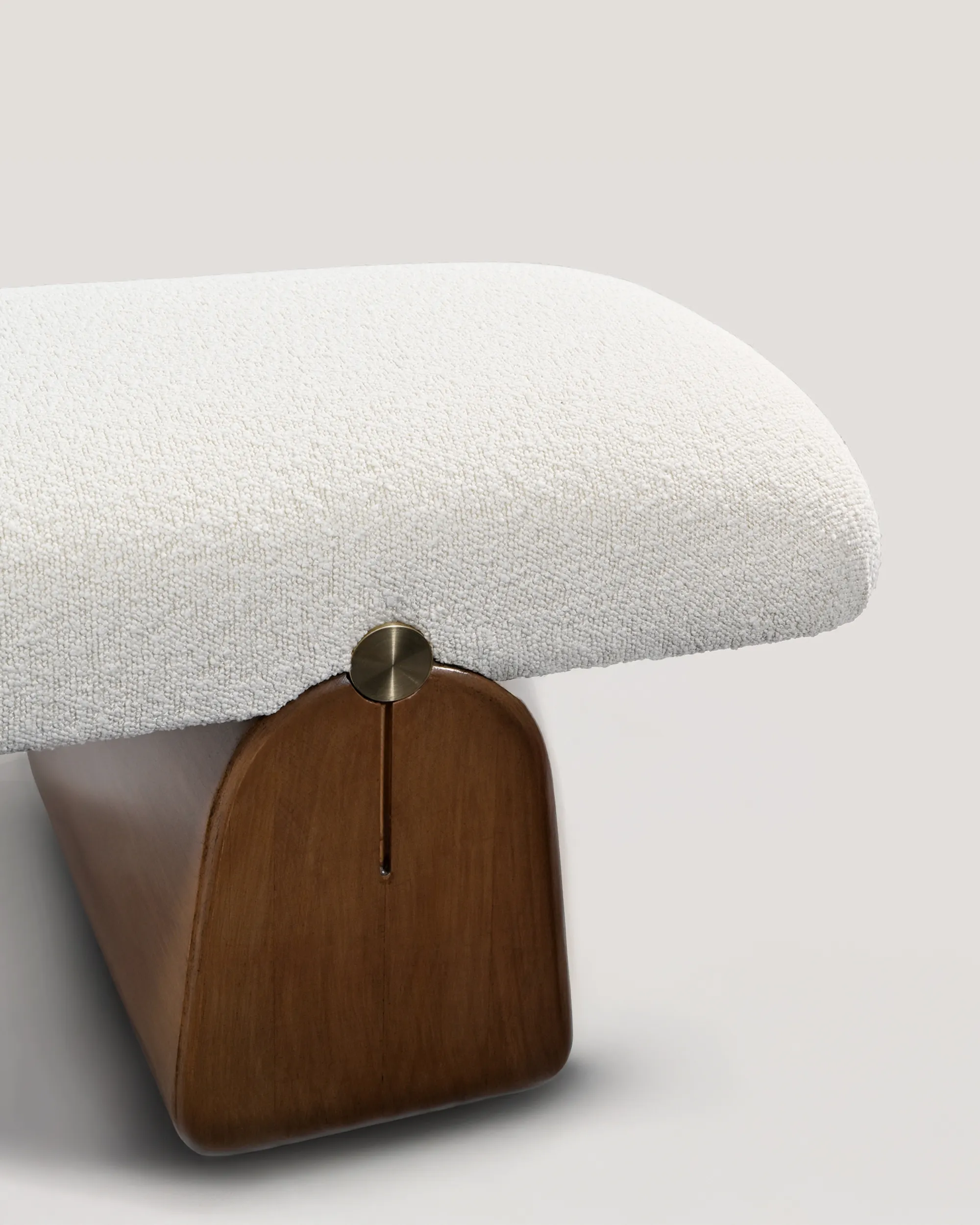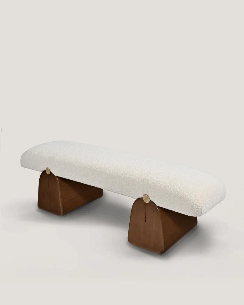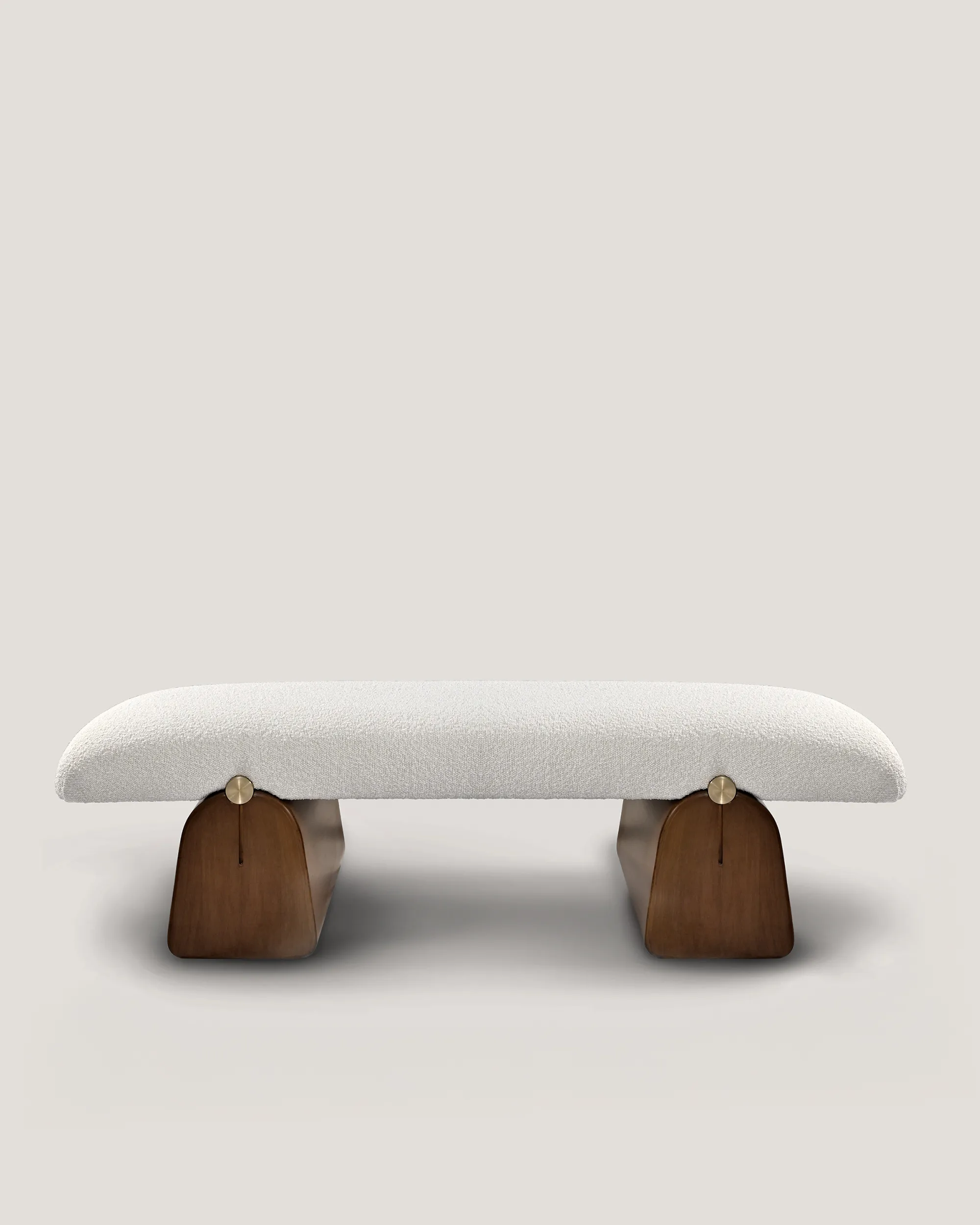 Boucle fabric upholstered bench with brass detailed, hand-carved solid wood legs.