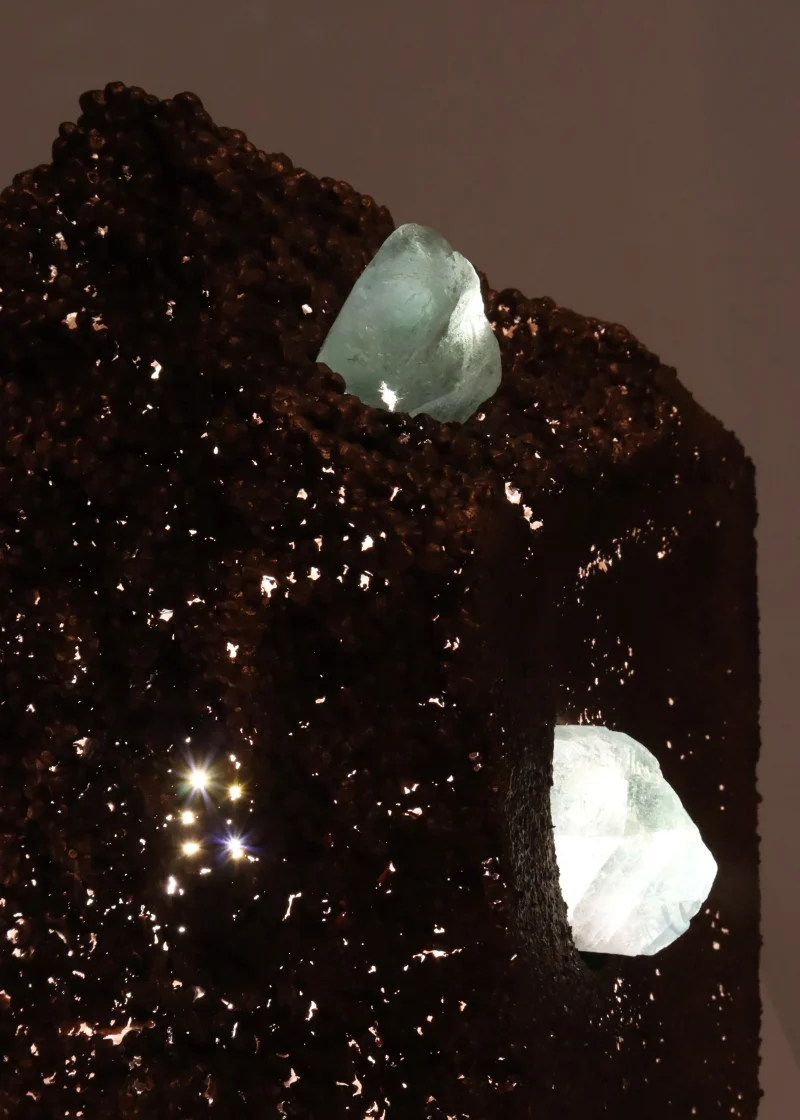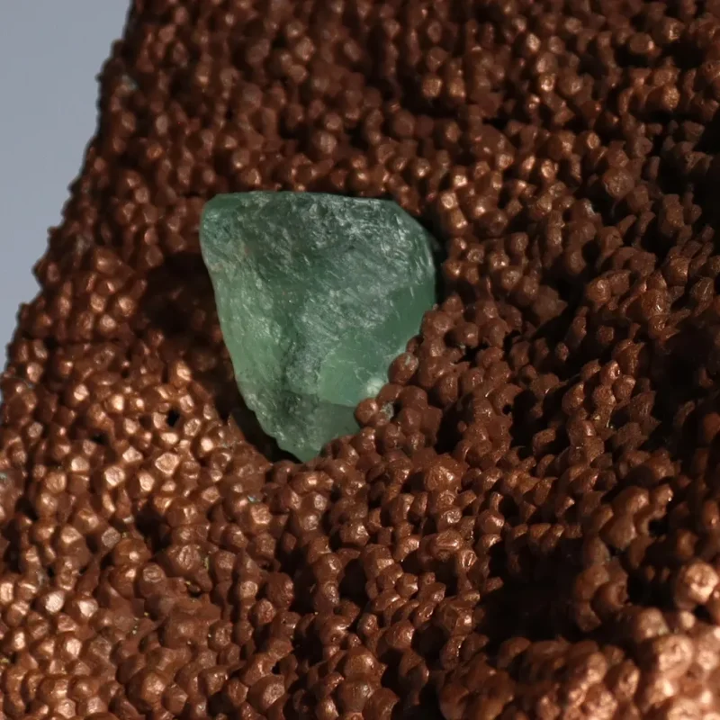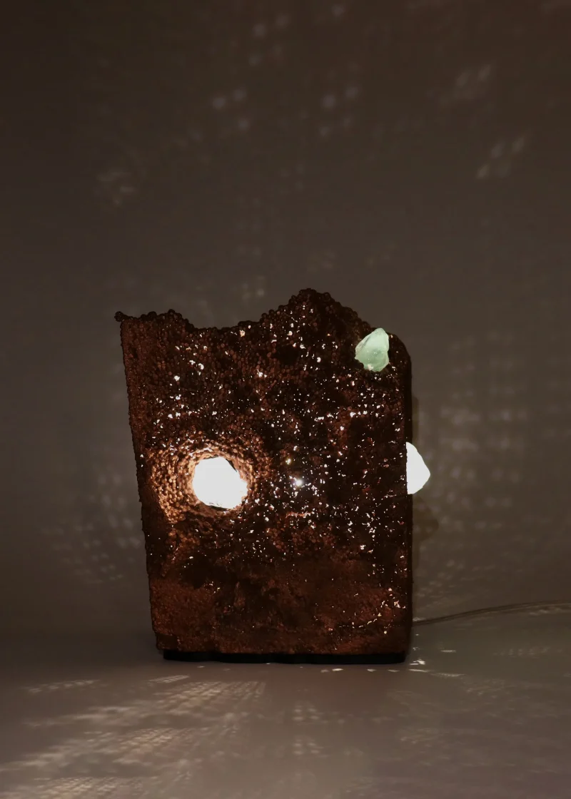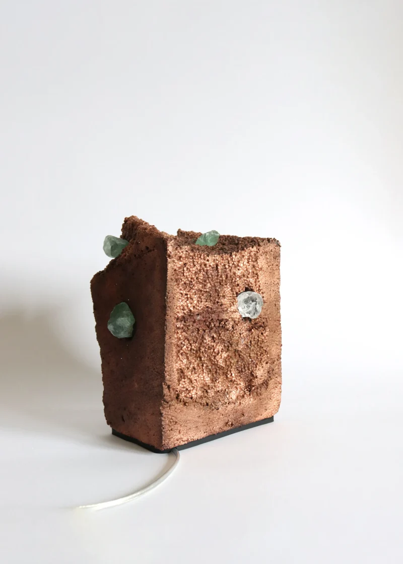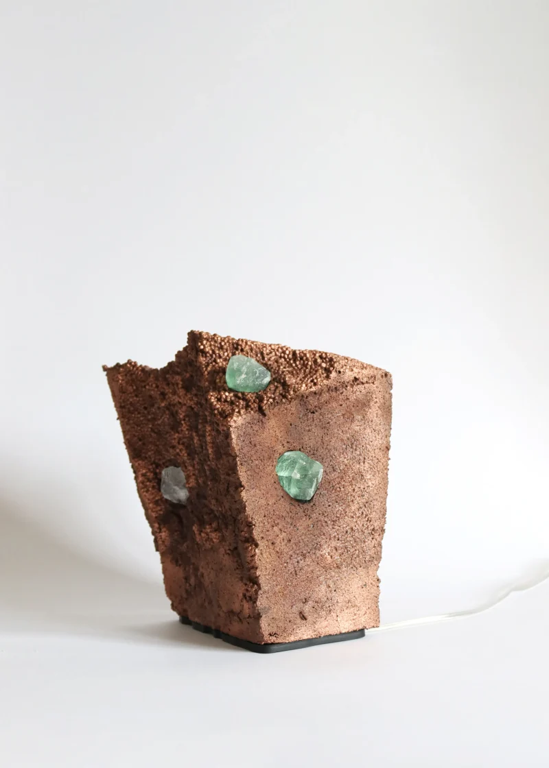 Lightening object remains a piece from a space but it’s only a found chunk of styrofoam on the beach by the Baltic Sea. It turned into a light shell of copper thanks to electroformed bath. Encrusted with natural minerals which shines the light from inside.