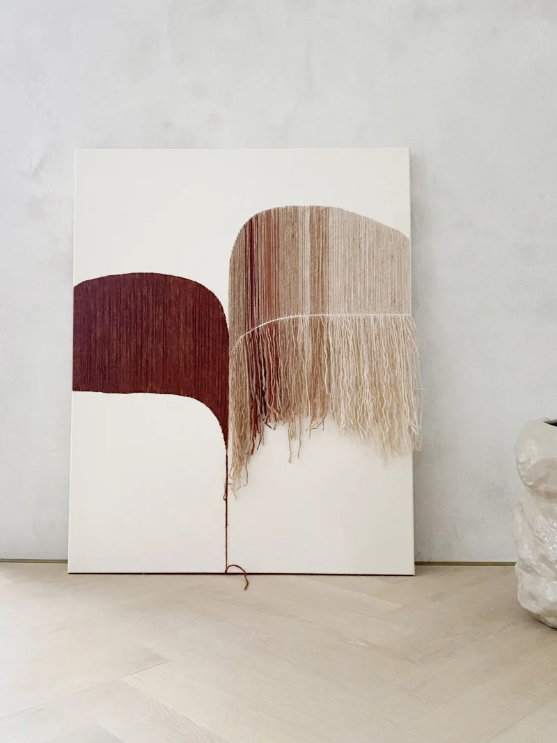 This hand-embroidered art piece “Isaro” features abstract, organic shapes stitched in earthy tones.
