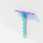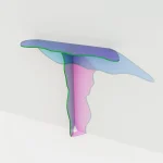 Brajak Vitberg Console table from Isola Collection. Made of two laminated glass pieces with holographic foil. Metal detail is applied under the glass panel in order for console table to be fixed to the wall.