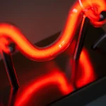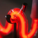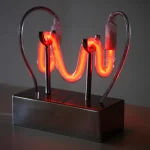“Jeg ville blive” was showcased at the Swedish Embassy in Copenhagen in 2023. This captivating piece features a polished stainless steel base that elegantly supports a curved neon tube, emitting a warm, red glow. Perfect for placing on a desk, shelf, or side table, it offers a subtle yet striking illumination that adds a touch of modern sophistication to any space.