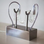 The piece includes a transformer placed under the stainless steel base. The electricity can be custom-made to fit any country’s standards.