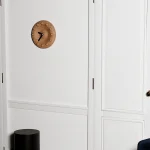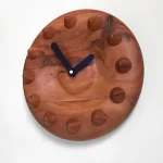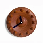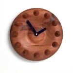 Jambú wall clock with turned geometric time indicators, for indoor use; Single piece of certified solid wood (DOF), with satin finish; Translucent blue acrylic hands; Quartz mechanism.