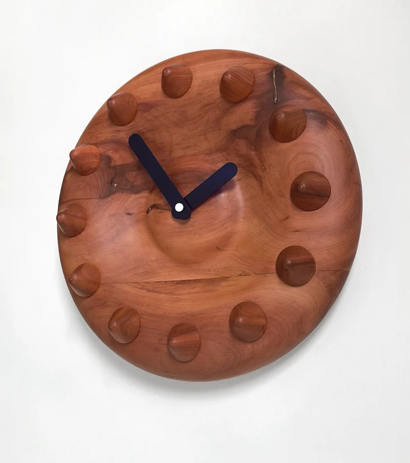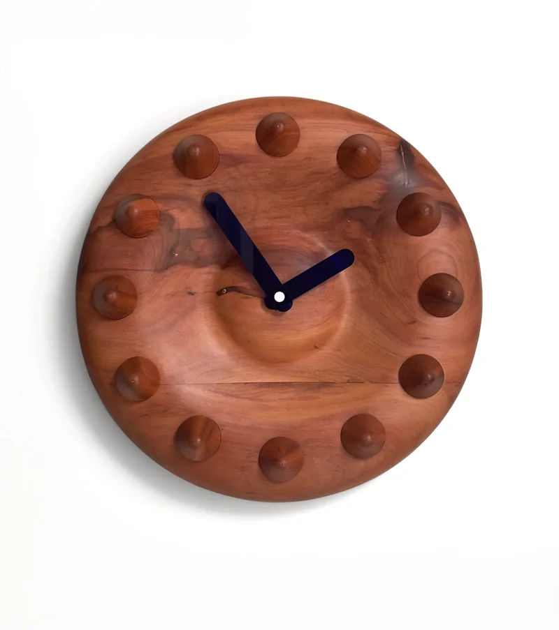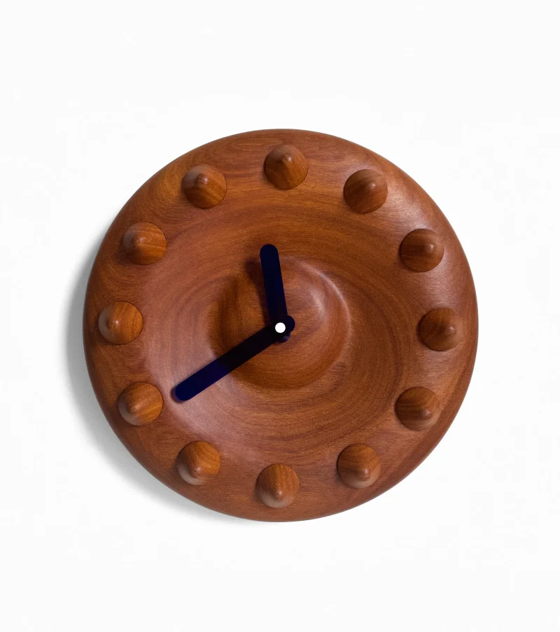 Jambú wall clock with turned geometric time indicators, for indoor use; Single piece of certified solid wood (DOF), with satin finish; Translucent blue acrylic hands; Quartz mechanism.