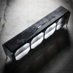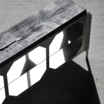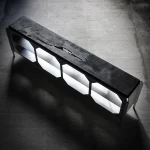 The console is available in multiple configurations: four openings, three openings, or two openings; with double-sided openings or one face closed. It can be finished with either a wood or aluminum top. The ebonized ash surface introduces depth and warmth, subtly contrasting with the cool metallic frame. Both functional and sculptural, the JNK540 Console is conceived as a versatile object that adapts to different spaces while maintaining a clear contemporary identity.