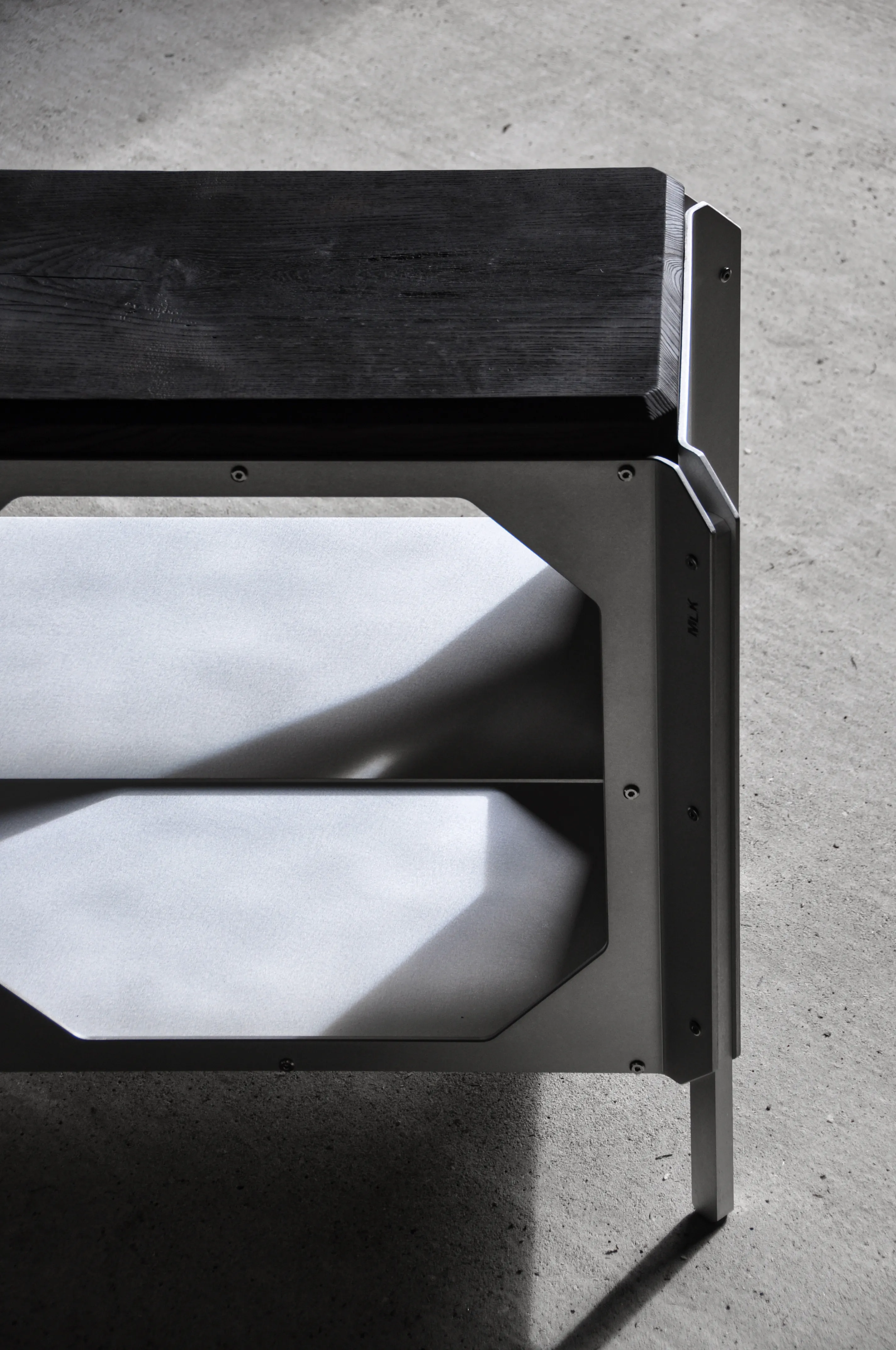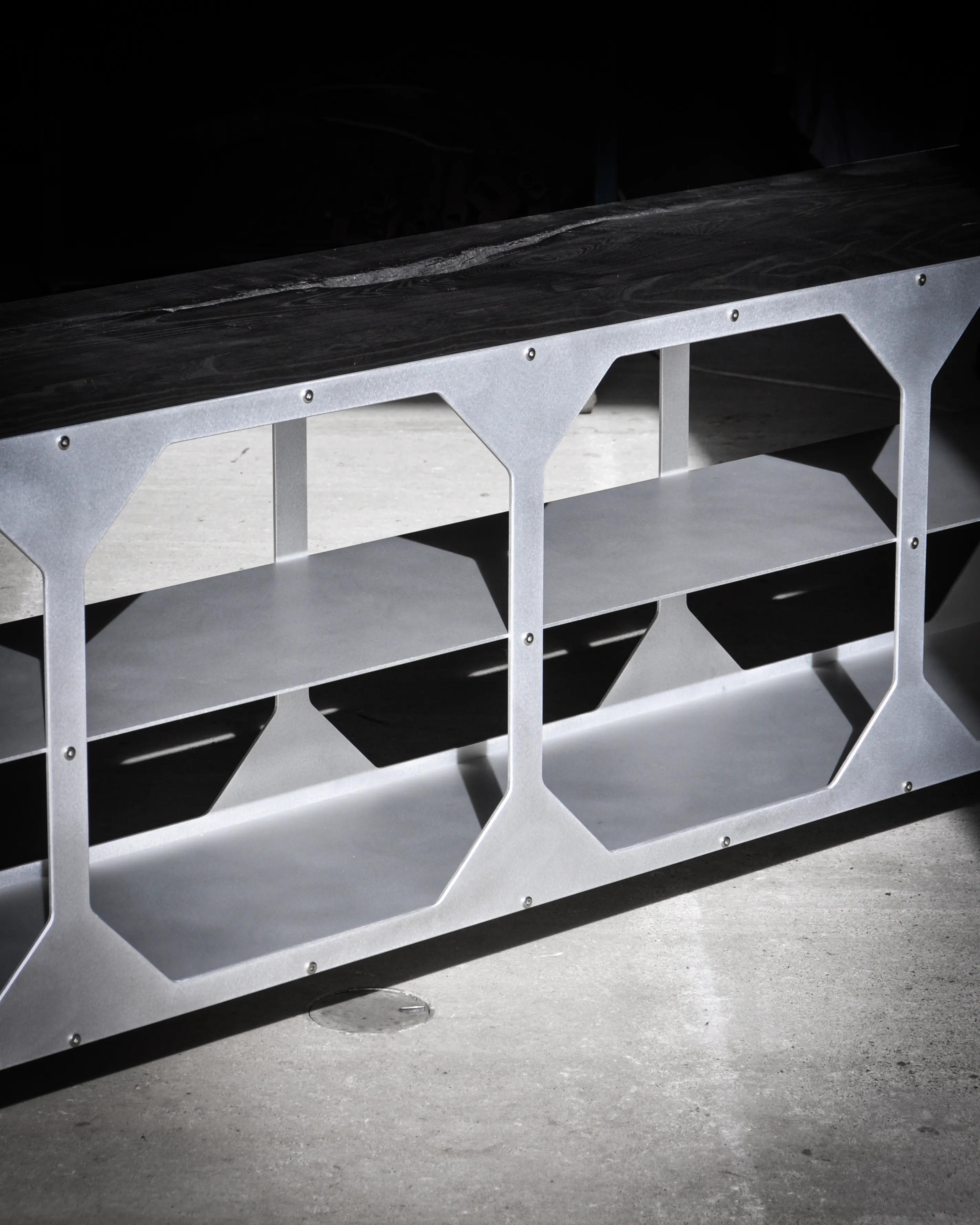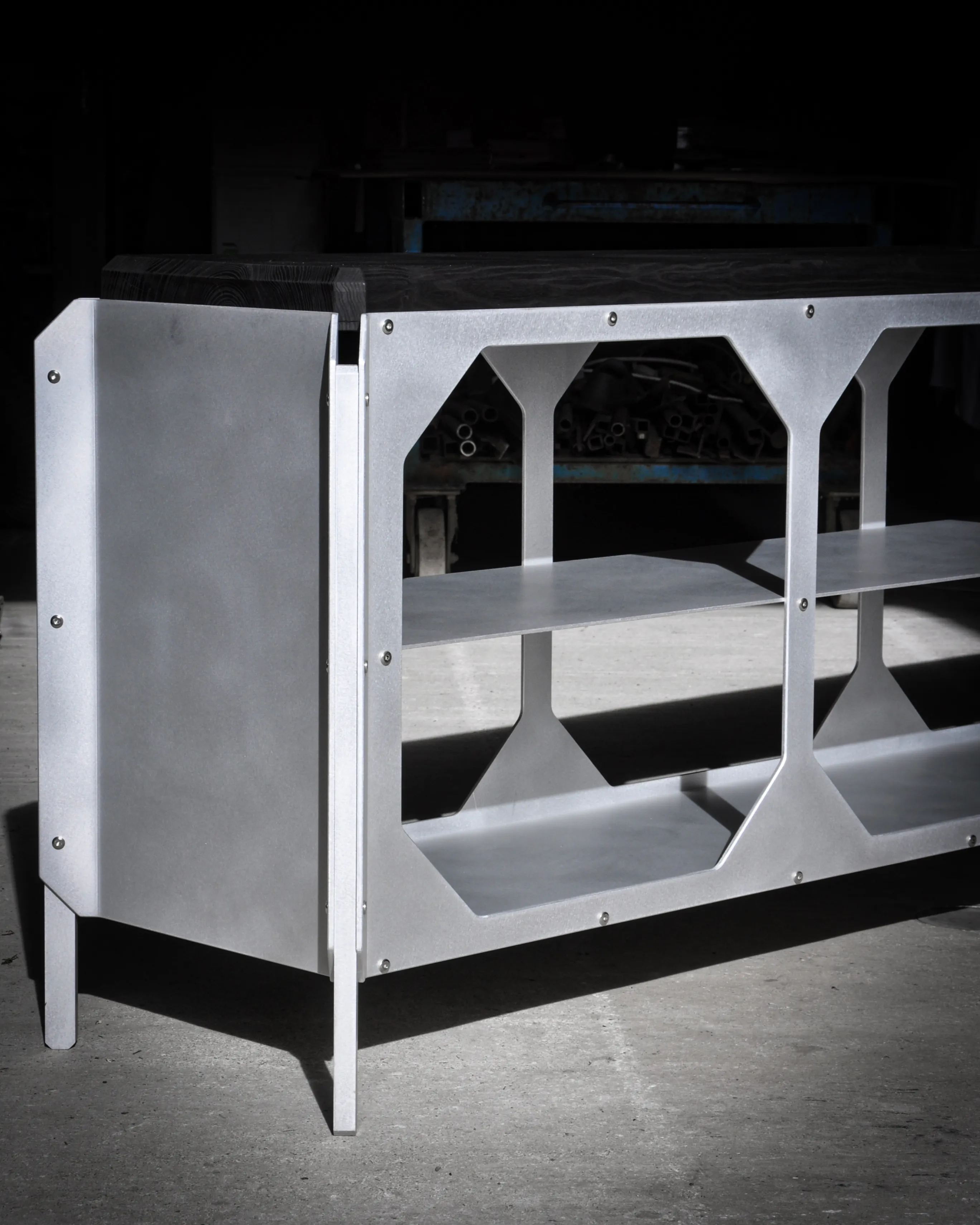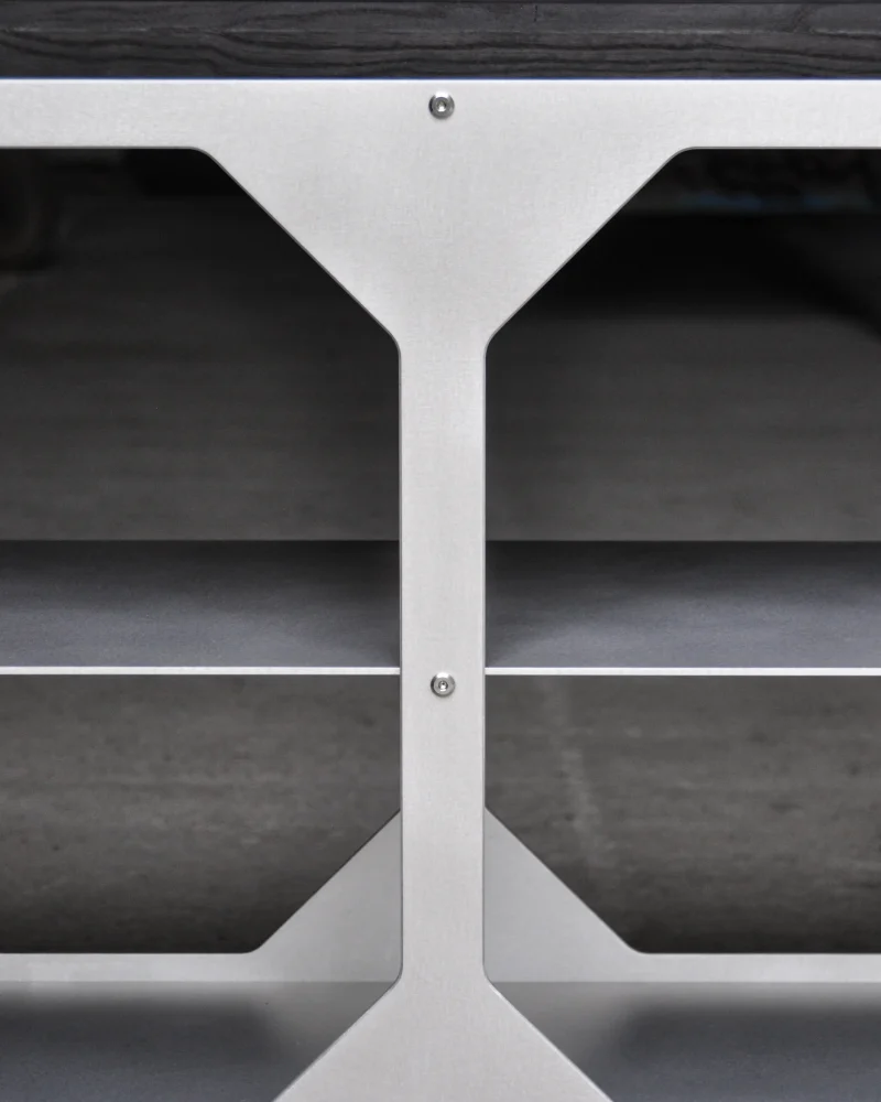 The JNK540 Console explores a dialogue between structure and surface, where industrial rigor meets refined craftsmanship. Its matte aluminum body, assembled with exposed fasteners, emphasizes precision and construction as a visual language. The modular openings define the façade, creating a strong graphic rhythm that evolves with light and perspective, while the elevated stance lends the piece an architectural lightness.