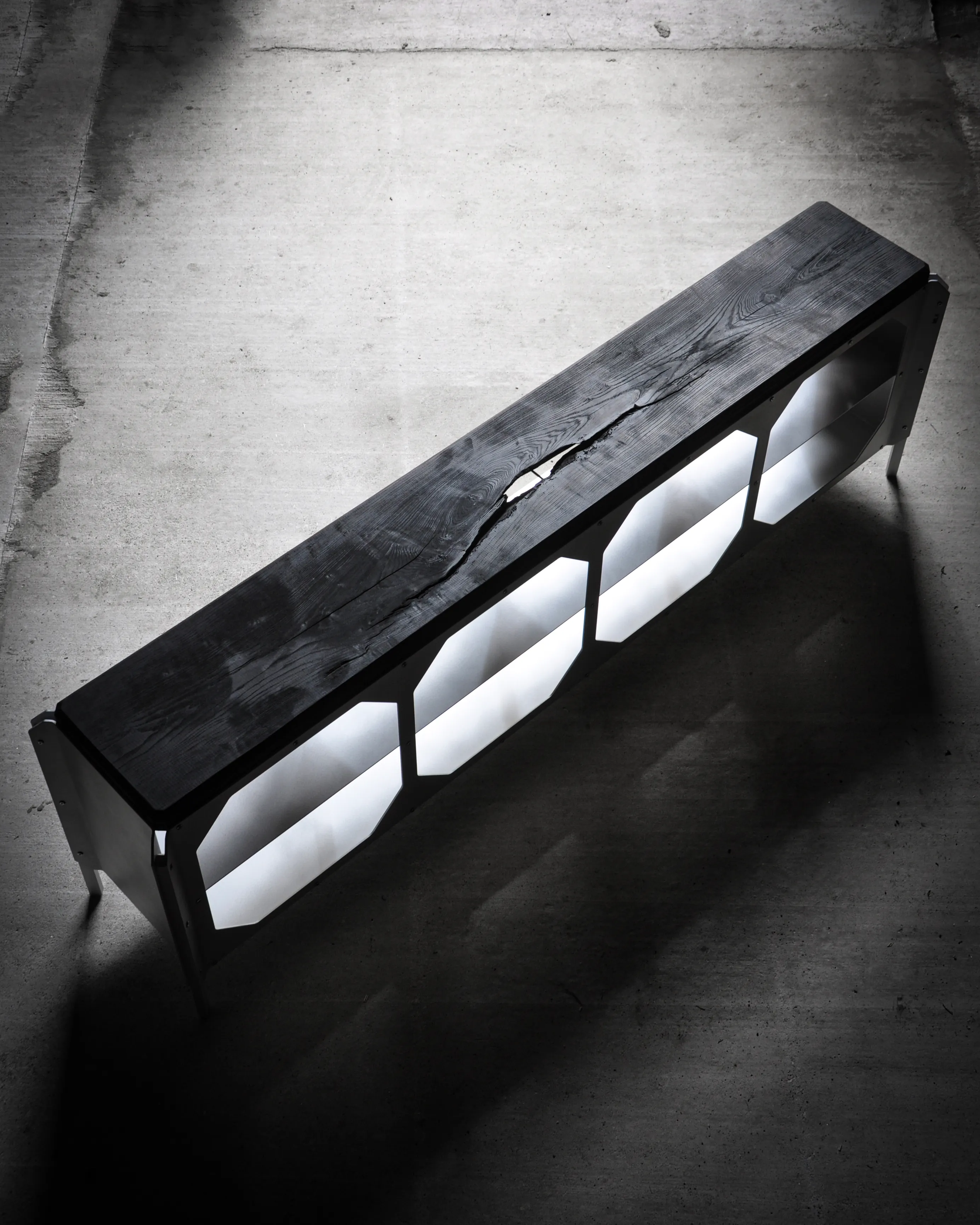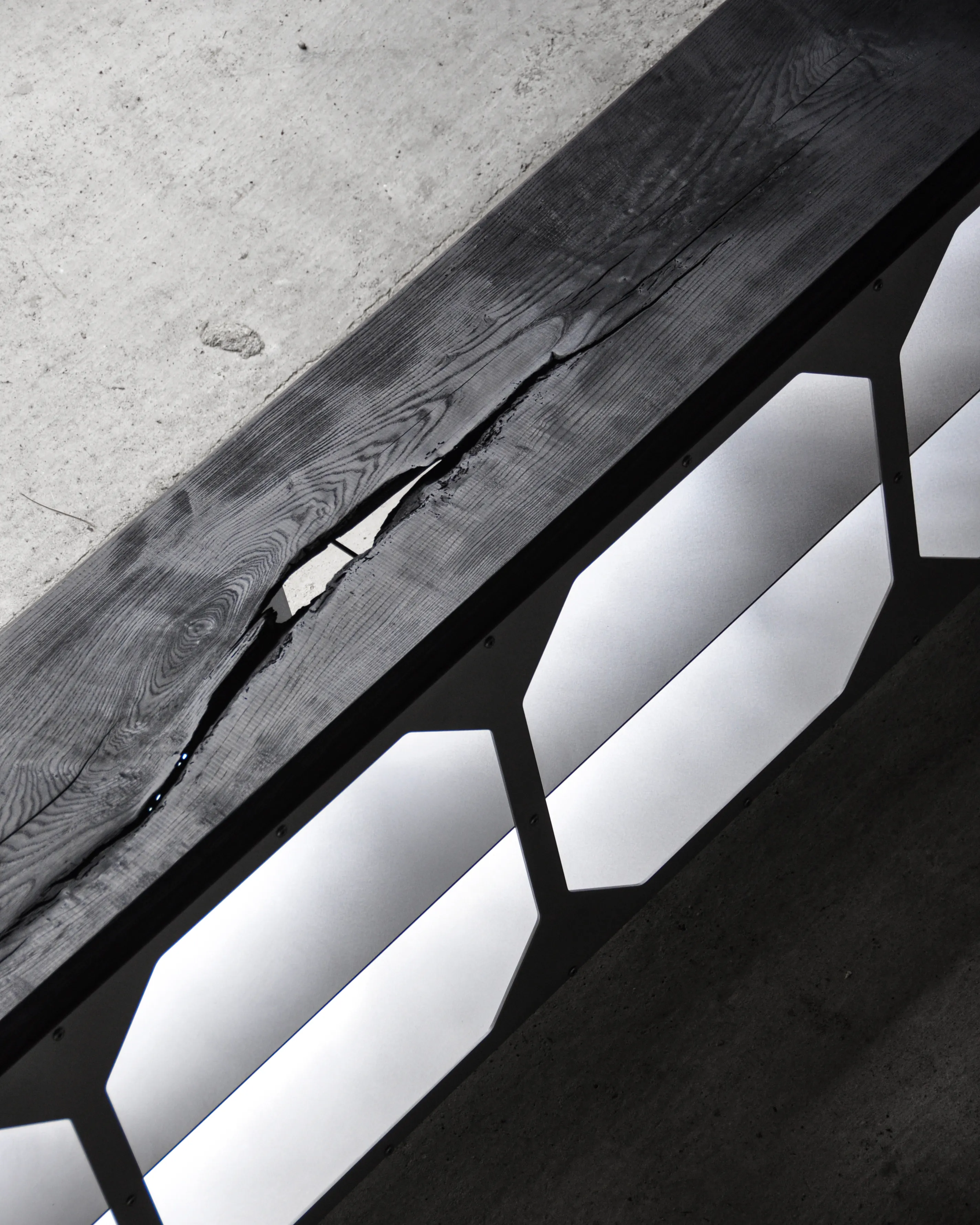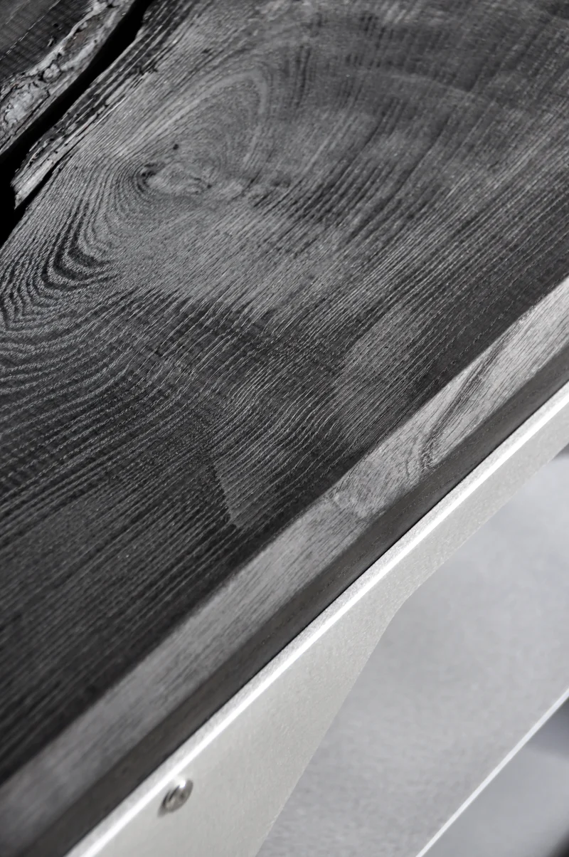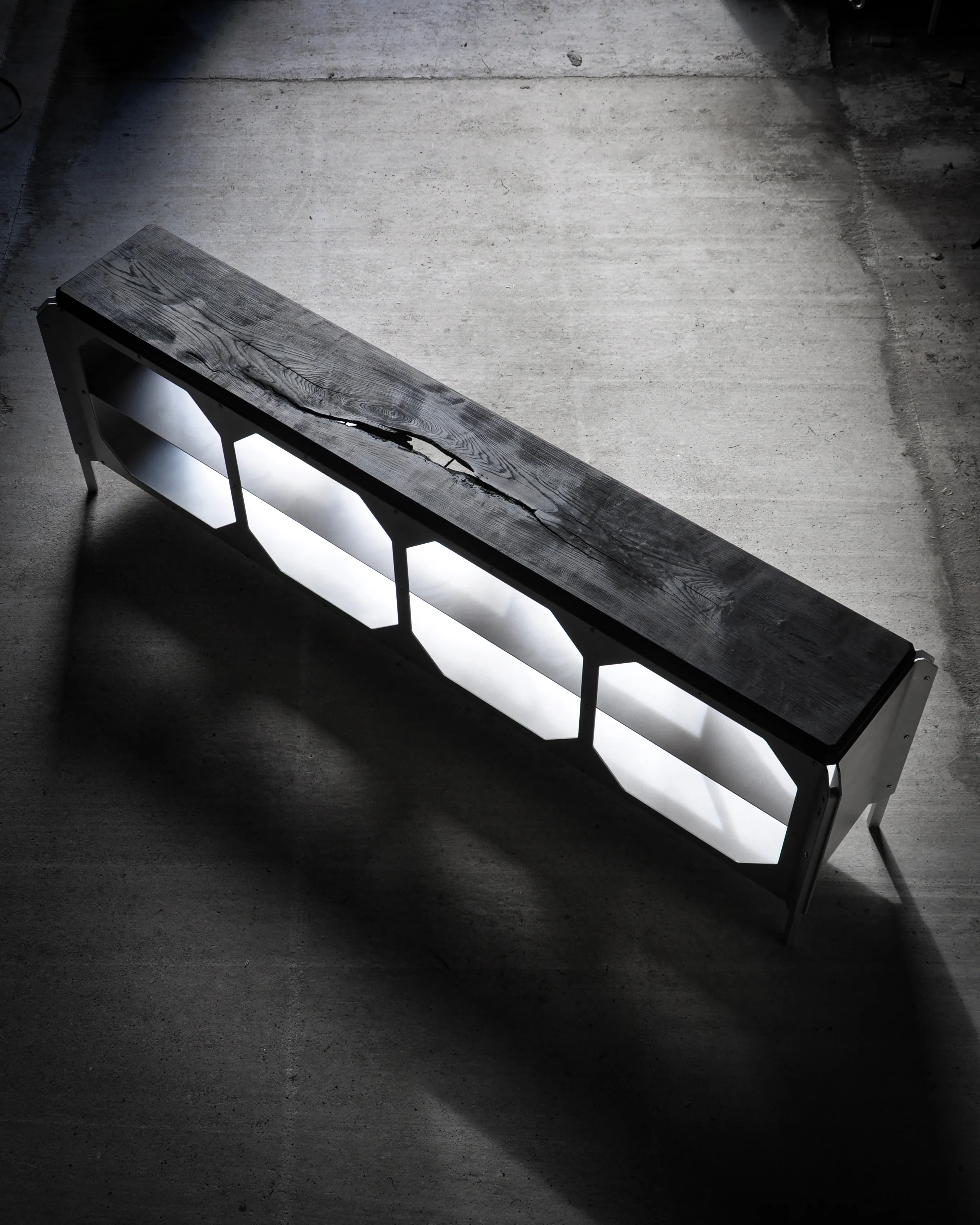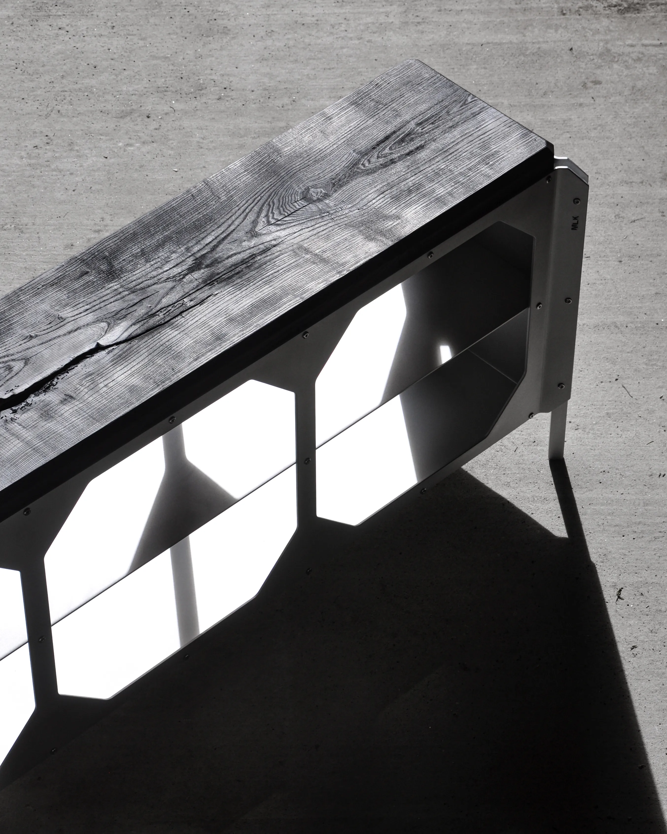 The JNK540 Console explores a dialogue between structure and surface, where industrial rigor meets refined craftsmanship. Its matte aluminum body, assembled with exposed fasteners, emphasizes precision and construction as a visual language. The modular openings define the façade, creating a strong graphic rhythm that evolves with light and perspective, while the elevated stance lends the piece an architectural lightness.