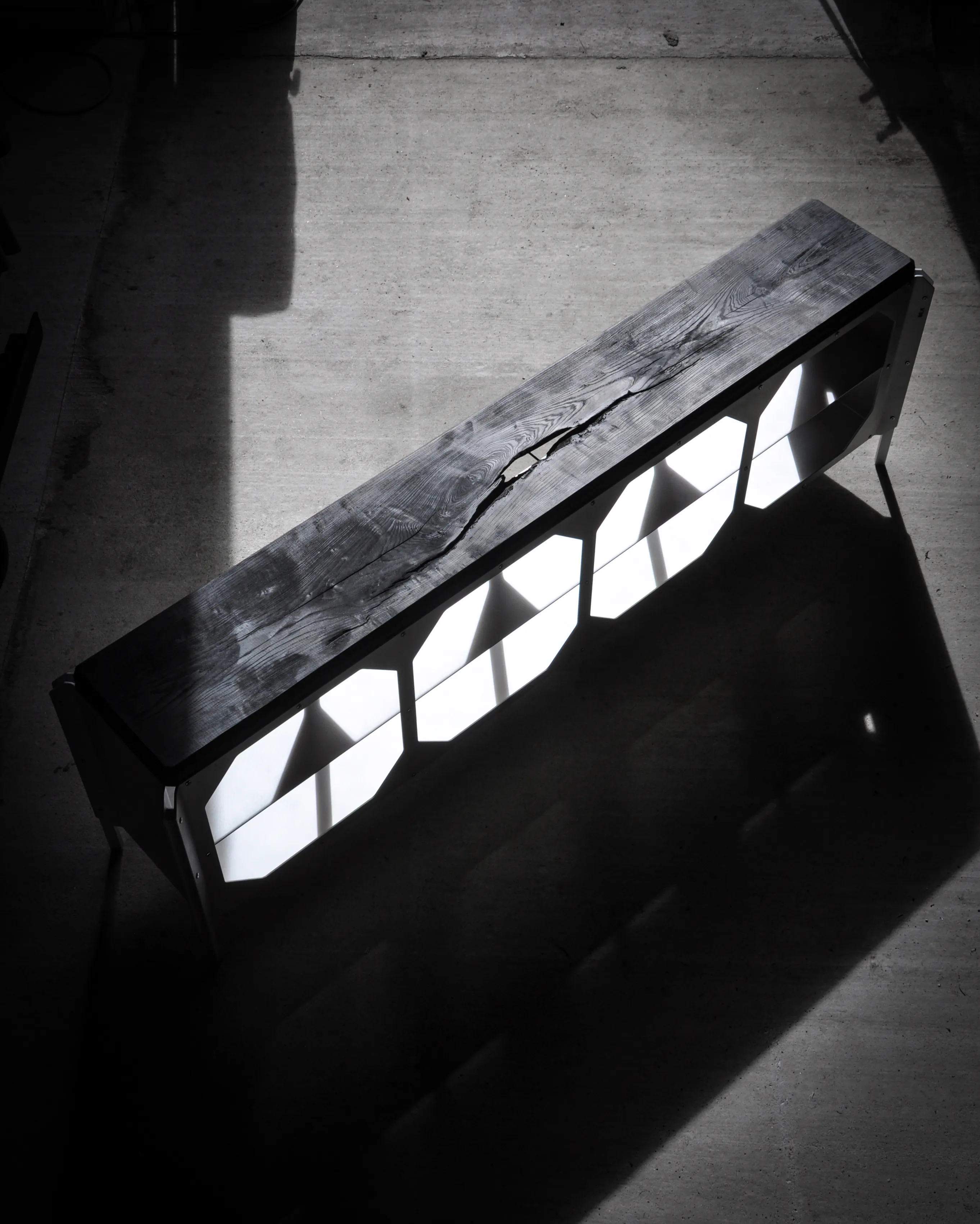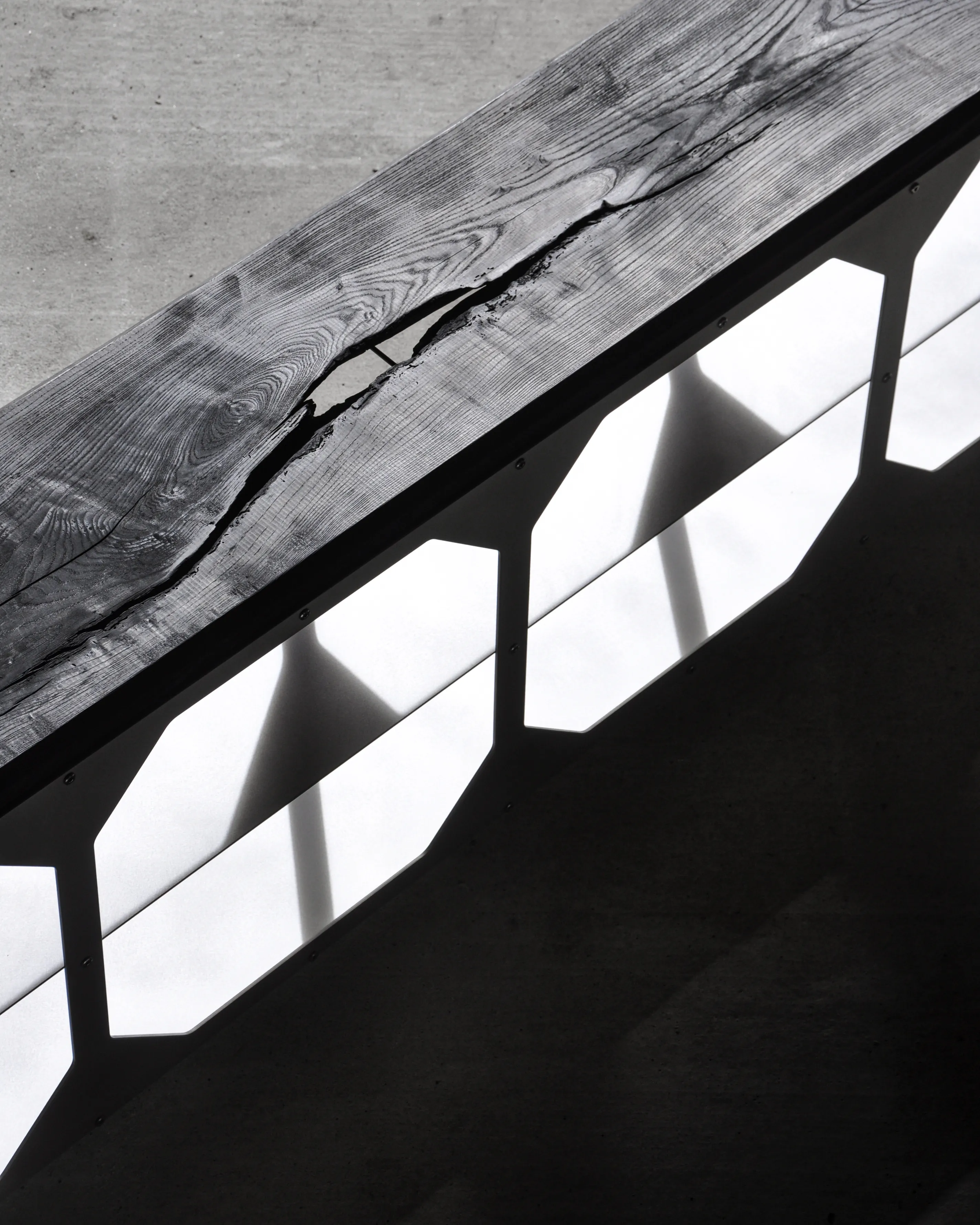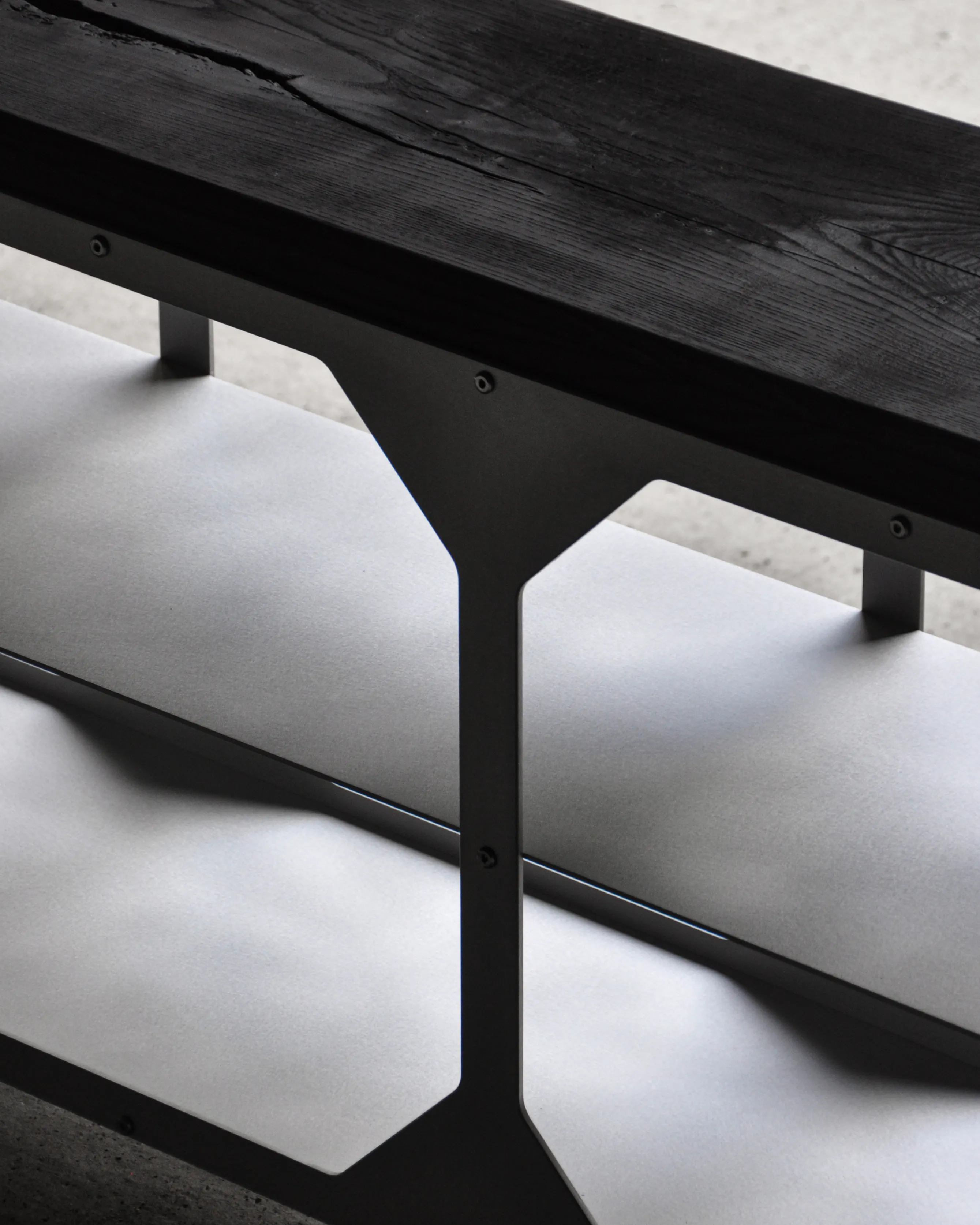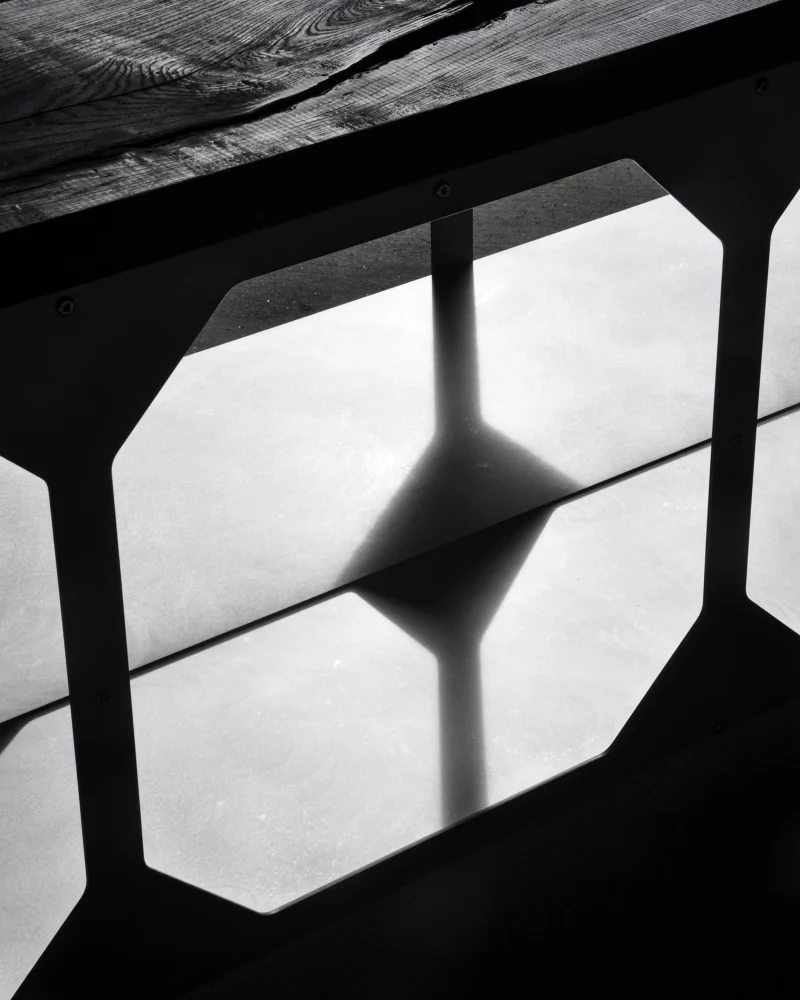 The JNK540 Console explores a dialogue between structure and surface, where industrial rigor meets refined craftsmanship. Its matte aluminum body, assembled with exposed fasteners, emphasizes precision and construction as a visual language. The modular openings define the façade, creating a strong graphic rhythm that evolves with light and perspective, while the elevated stance lends the piece an architectural lightness.